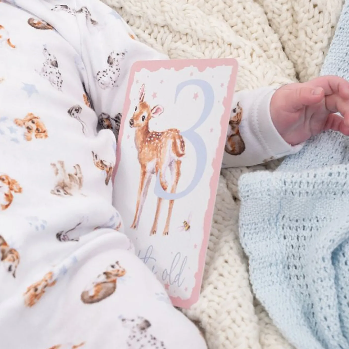 Celebrate a baby’s first year, first smiles and first steps with this gorgeous set of baby milestone cards. Including 24 cards each representing different milestones in a baby’s development, the cards are perfect for capturing special moments and feature new illustrations of baby animals, beautifully painted by Hannah Dale. On the reverse of each card there is place to put the date and a little note about the special moment. Cards measure 6 x 4 x 0.7 inches. Gift box packaging. Sustainably sourced from responsibly managed forests.