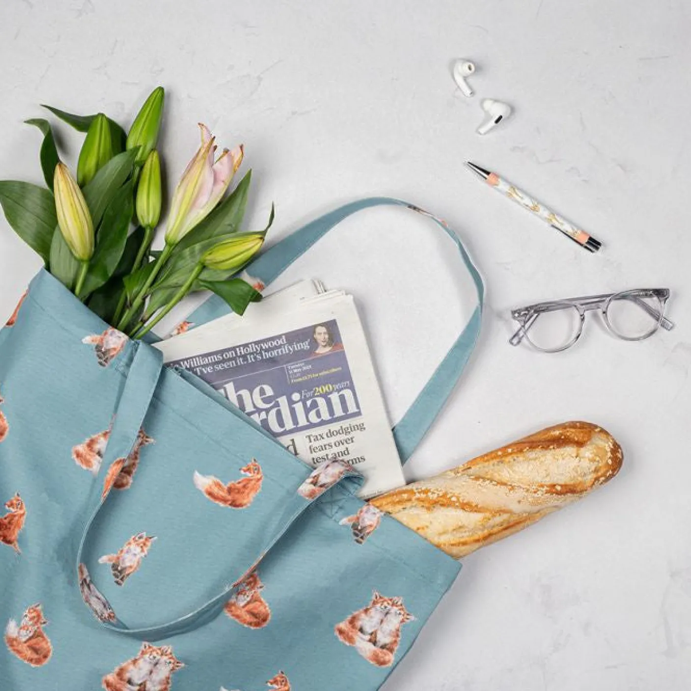 This stylish and handy foldable shopping bag featuring the ‘Bright Eyed and Bushy Tailed‘ foxes design is perfect to have in your bag when you’re in need of some extra space for shopping and can be cleverly folded into an internal pocket until needed. 80% cotton, 20% polyester. Machine washable. Measures 6.29 x 6.29 inches when folded. 16.14 x 17.32 inch unfolded.
