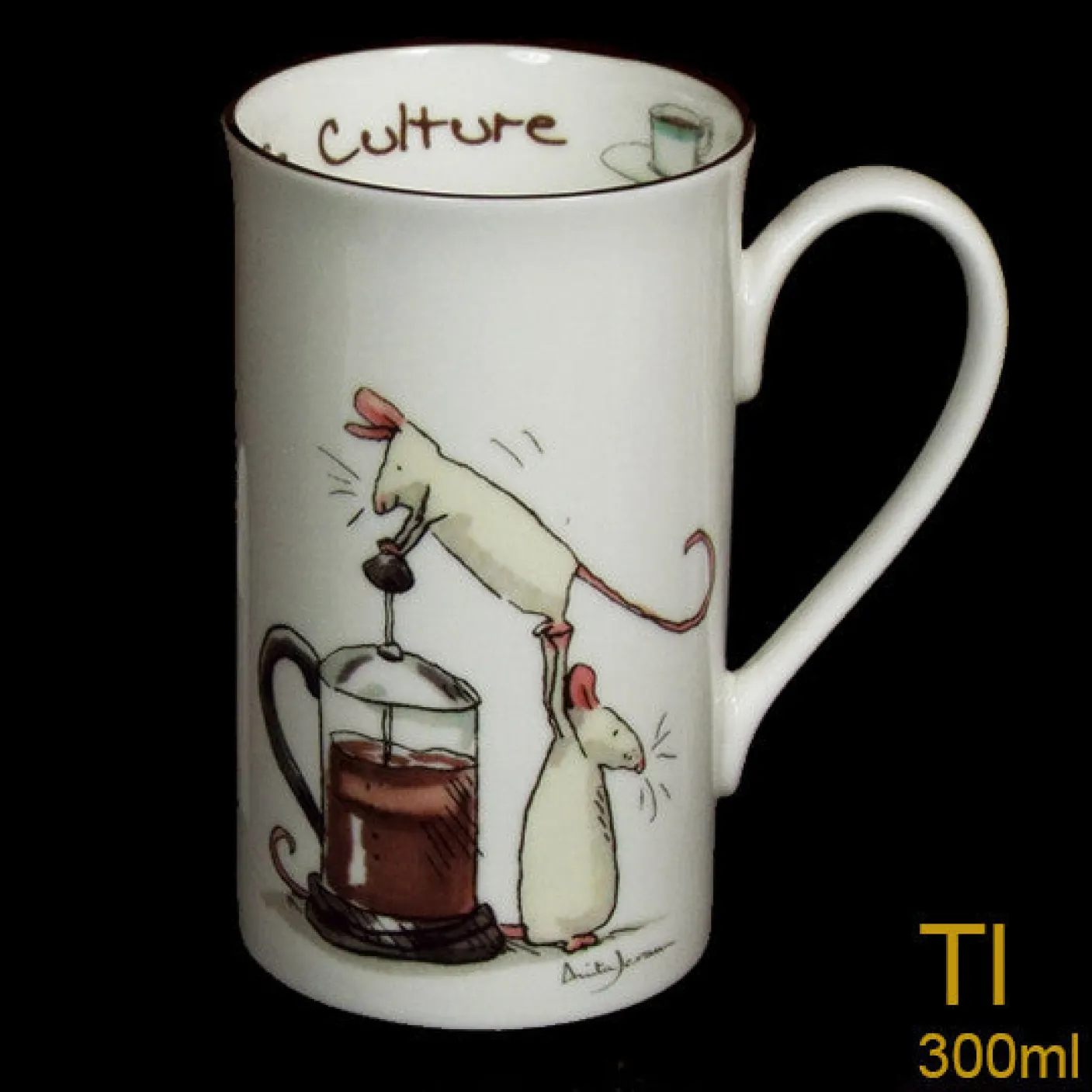 A charming tall Bone China mug by artist Anita Jeram. Depicts two cute white mice making coffee in their caffettiera on the front and drinking it on the back! The unusual shape holds 10 fl oz and is hand decorated in Staffordshire, England. This mug has a gold rim and is not microwavable.