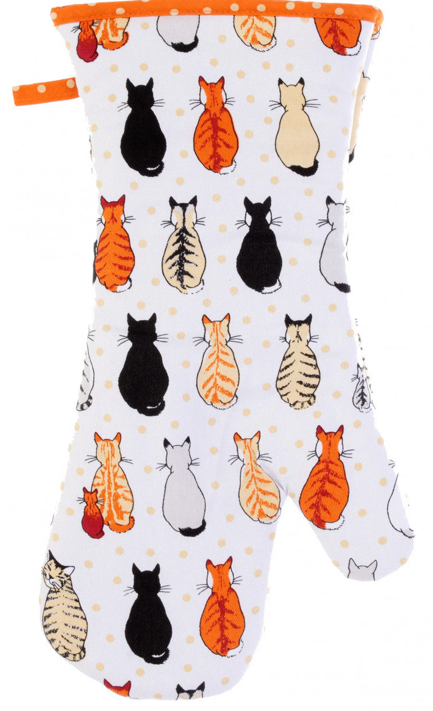 An Ulster Weavers classic design, this Cats in Waiting Gauntlet features our furry friends on a white background with subtle beige polka dots, with an orange complimentary trim and handy loop for hanging. This useful kitchen item contains a poly wadding filling for a little added protection. Use to safely handle hot dishes when preparing food.A perfect gift for anyone who loves cooking!