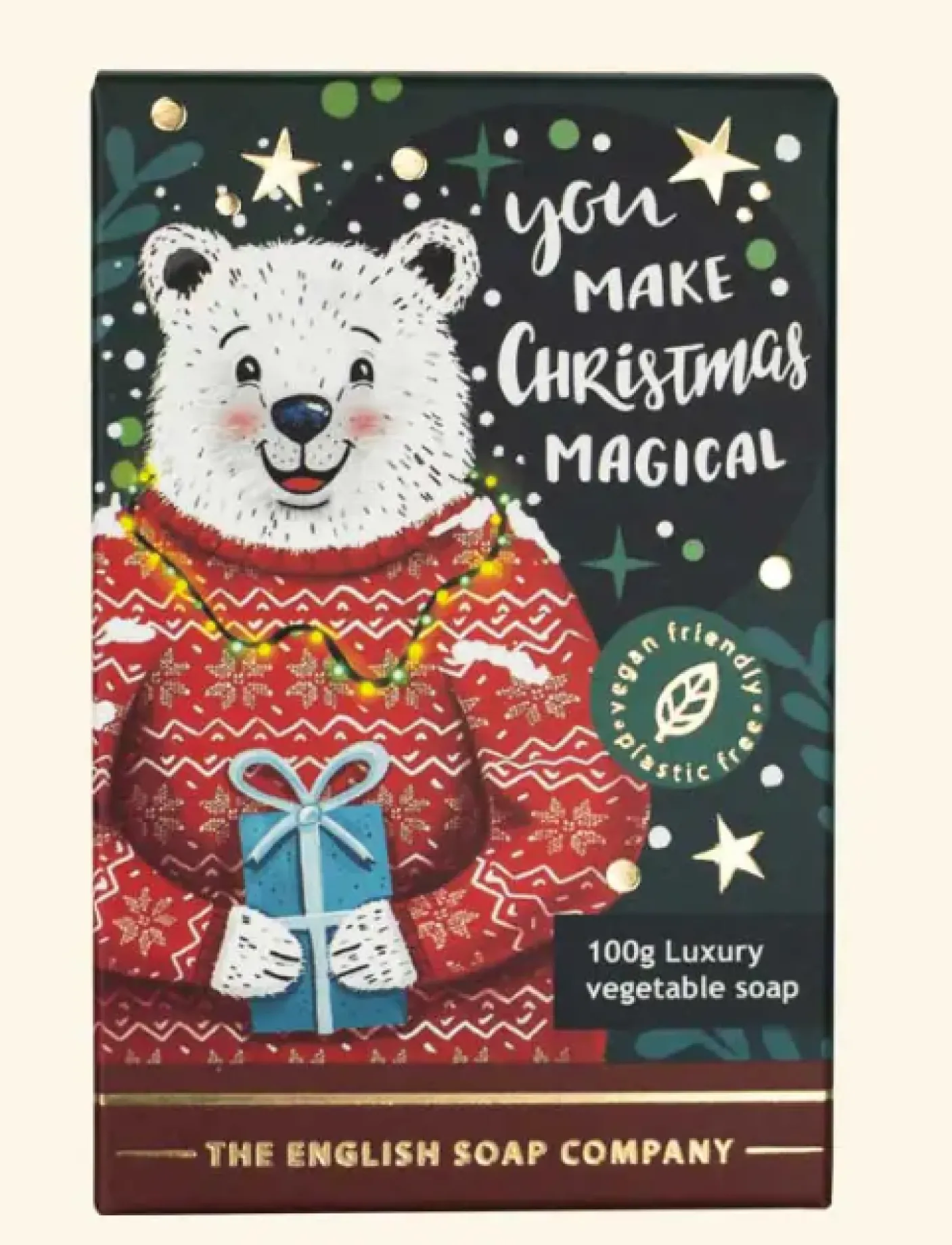 ‘You make Christmas magical,’ said Polar Bear. This Christmas Polar Bear Mini Soap features hand drawn illustrations that capture the yuletide joy and sentiment that the festive season brings. With lashings of gold foil and sparkles, this Christmas Polar Bear Mini Soap makes the perfect little festive treat, gift or stocking filler.