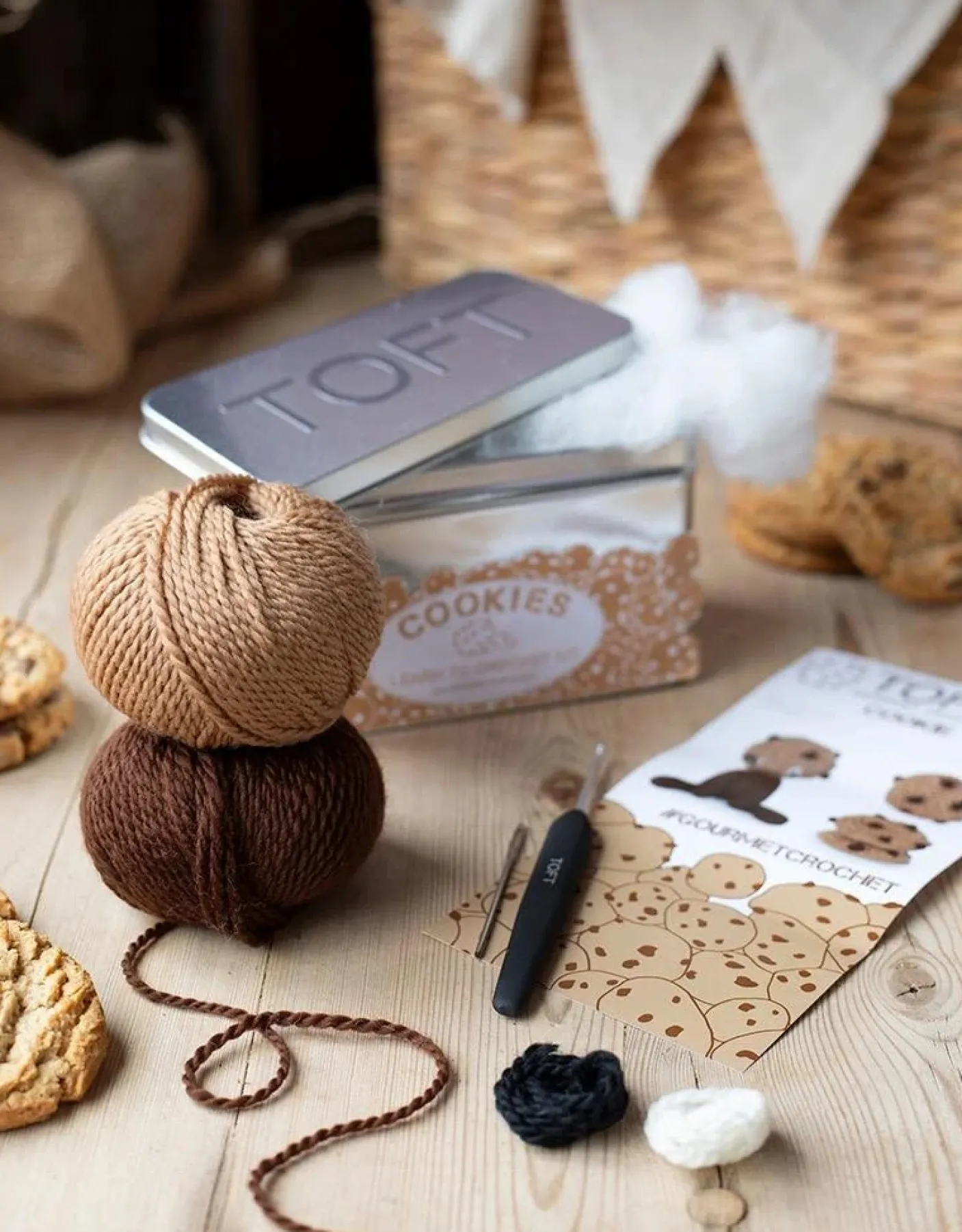 Introducing TOFT’s hand-crafted range of crochet confectionery, perfect for gifting and packed into a collectable keepsake tin, for storing your tools and notions inside, or for forming part of a play kitchen when gifted with crocheted food inside. This delicious gourmet crochet kit includes the yarn to make one cute Cookie character or four individual cookies for a plateful of play food. Whether you are looking to indulge yourself or a loved one, this tin of goodies is sure to delight the senses.