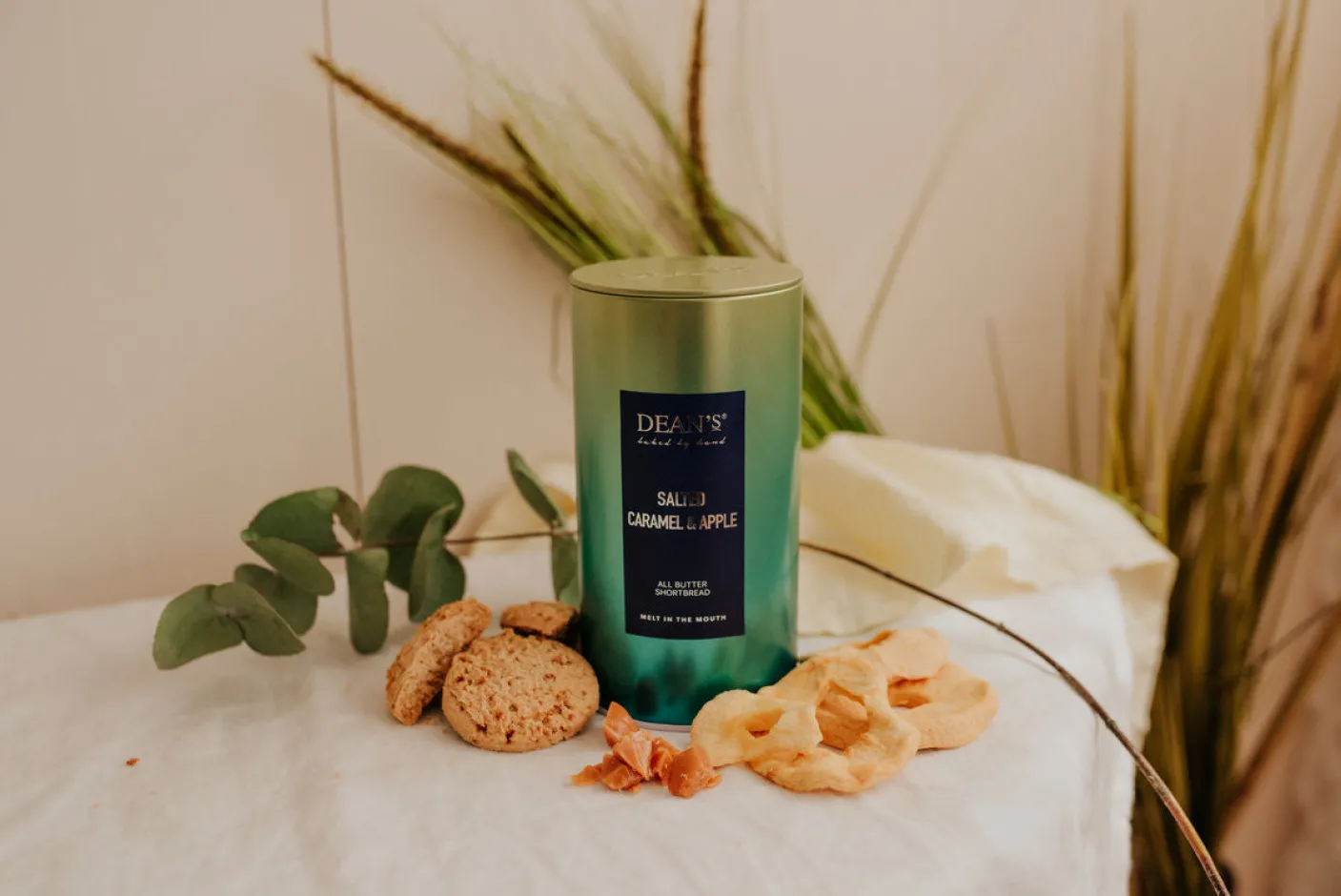 Wheat Flour (WheatFlour, Calcium Carbonate, Iron, Niacin, Thiamin), Salted Butter (29%) (Butter (Milk) Salt), Caster Sugar, Maize Starch, Salted Caramel Pieces (4.5%) [Sugar, Glucose Syrup, Cream (Milk), Butter (Milk), Water, Salt, Flavouring], Oat Flakes, Dried Apple Pieces (2.5%), Cassia, Apple Flavouring.