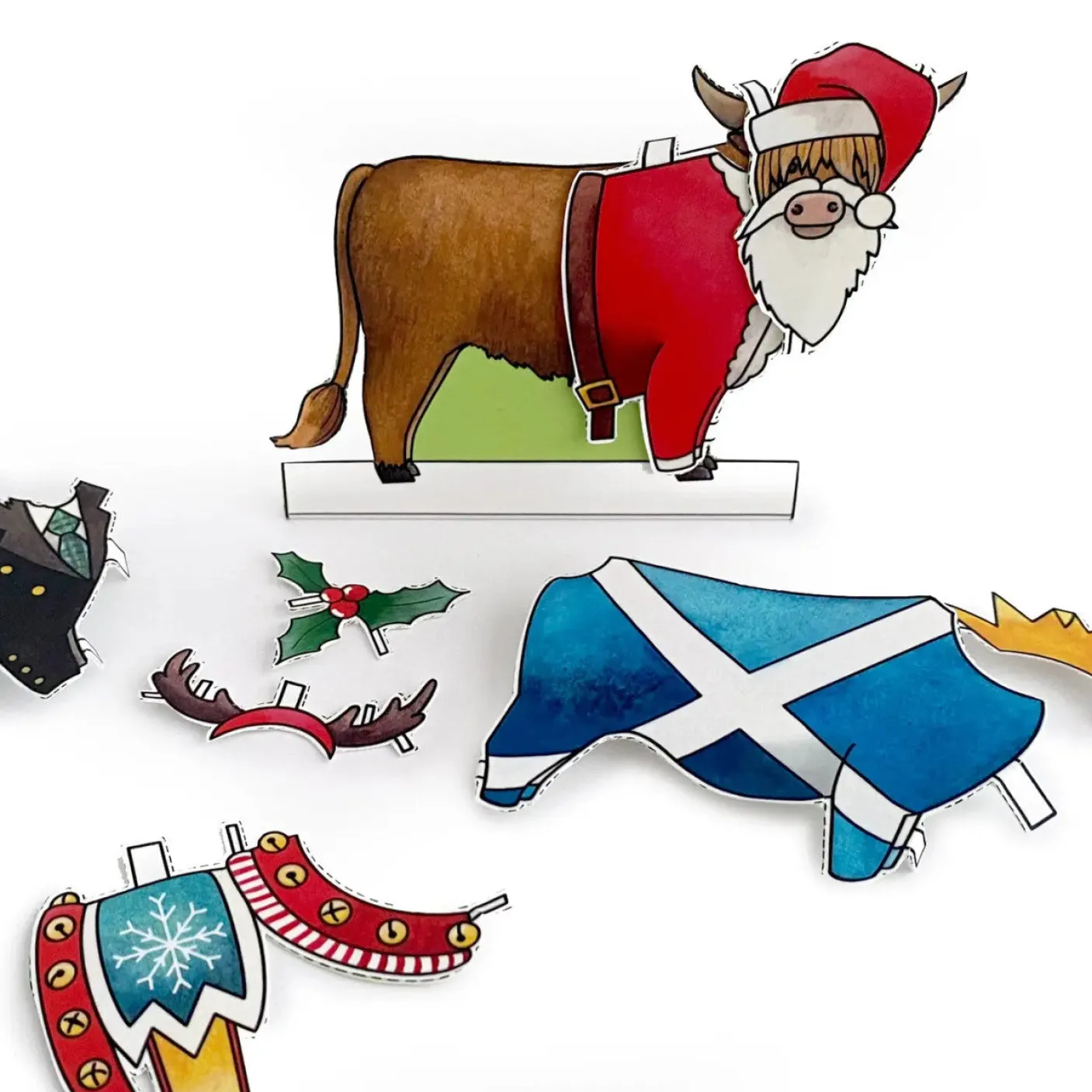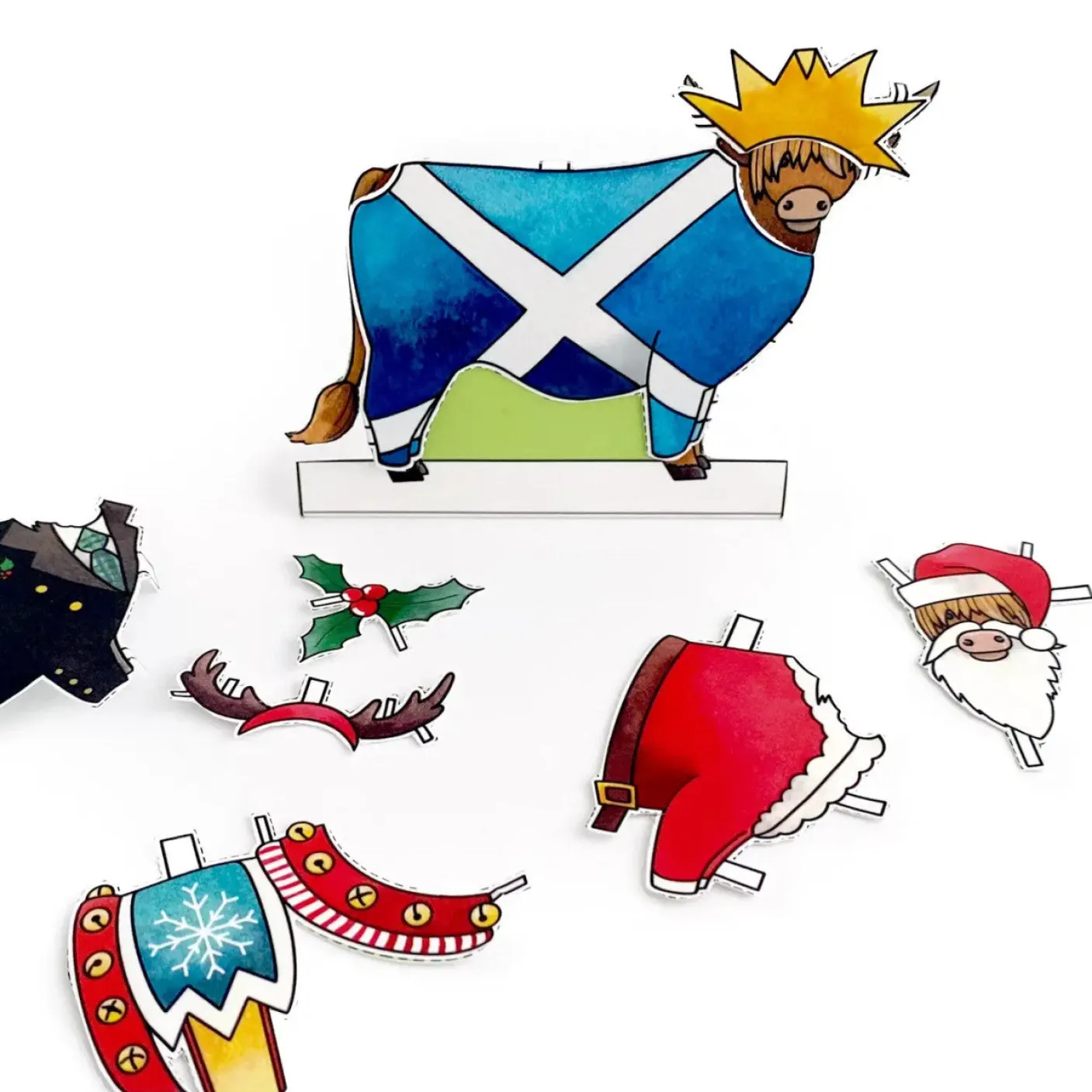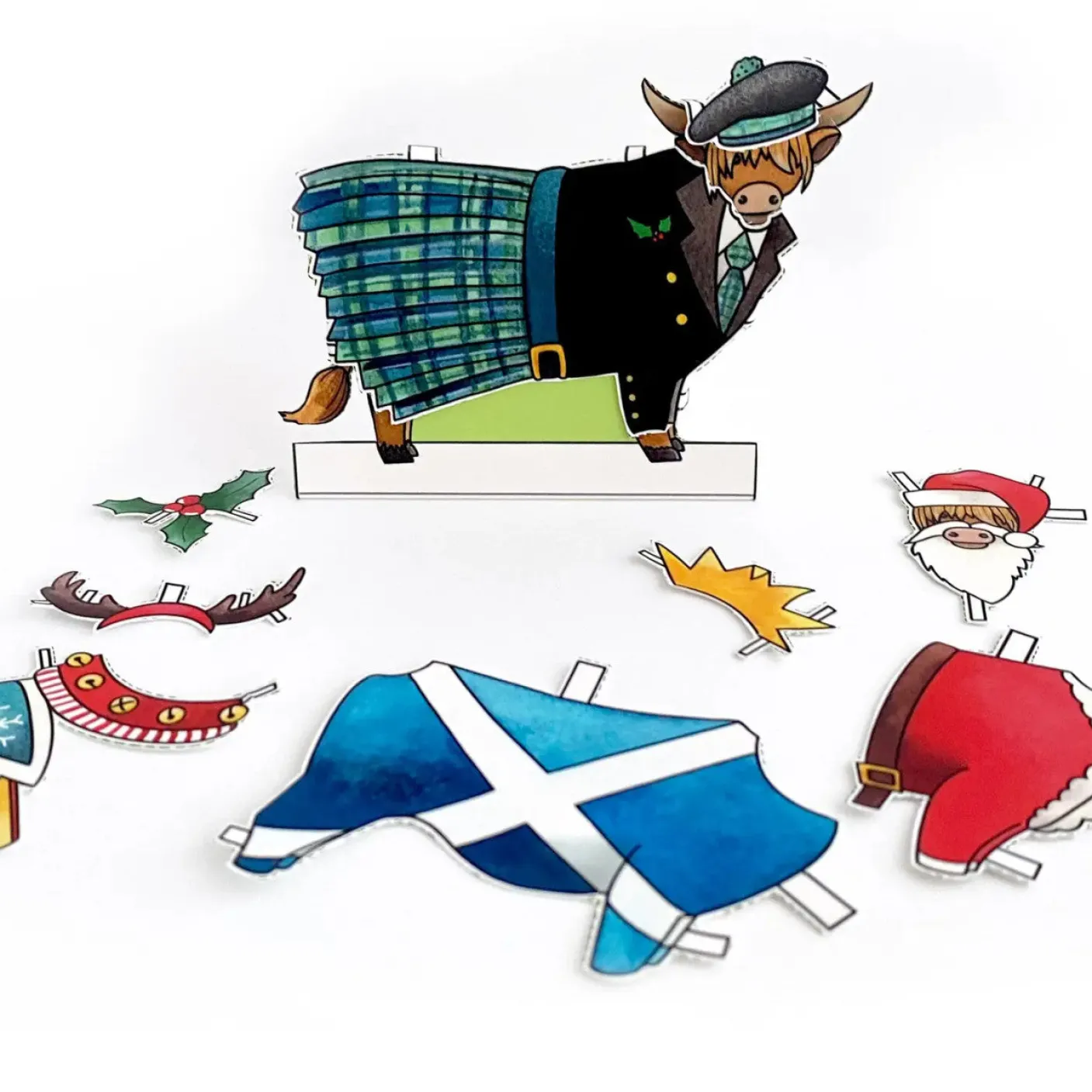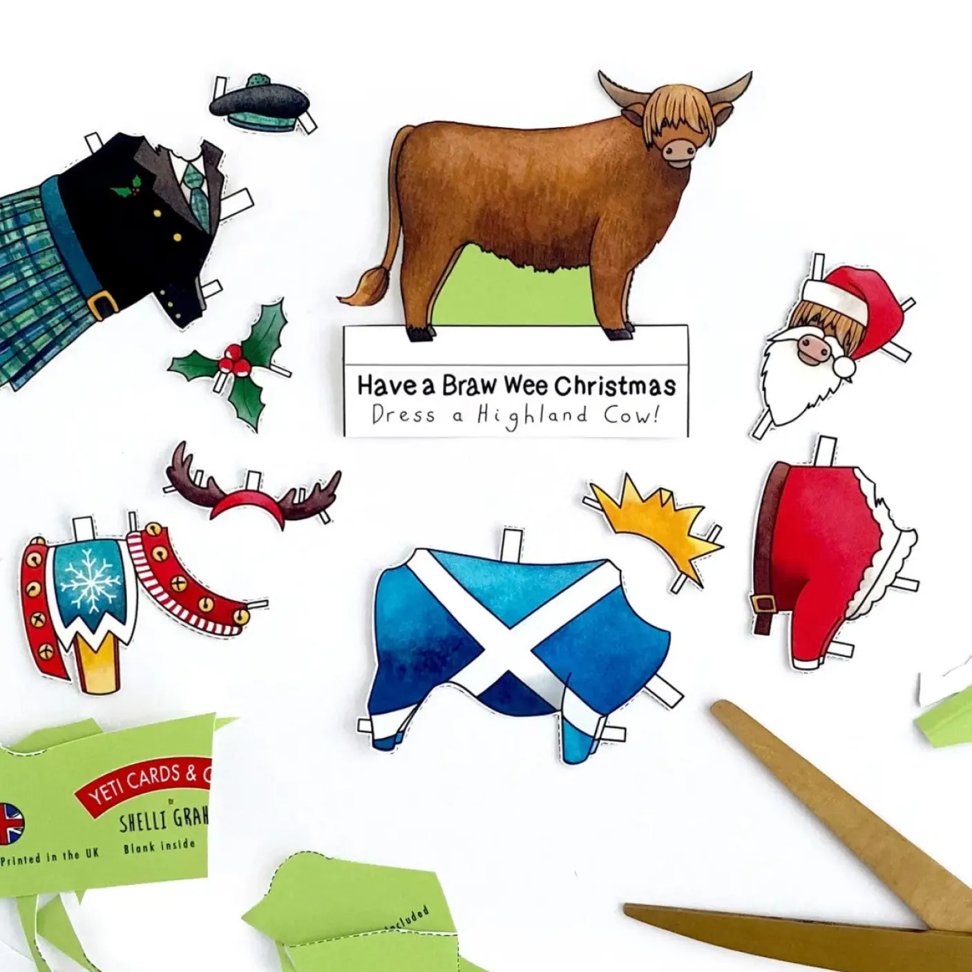 Get crafty this Christmas and send a card that can be transformed into a fun desktop decoration! ‘dress a highland cow’ Christmas cards by Yeti feature four christmas themed outfits; a saltire onesie, reindeer reigns, a santa outfit and a kilt. Simply cut around the dotted line and dress the highland cow in your favourite! ‘dress a highland cow’ christmas cards are printed onto high quality trucard, a specialist greetings card material that is glossy coated and scratch-proof on the outside, and uncoated on the inside so it’s easy to write on. 300gsm card is used for high-quality greetings cards that last. The card is blank inside for your own message and comes with a red paper envelope. Card measures 148mm x 148mm and is suitable for letter post.