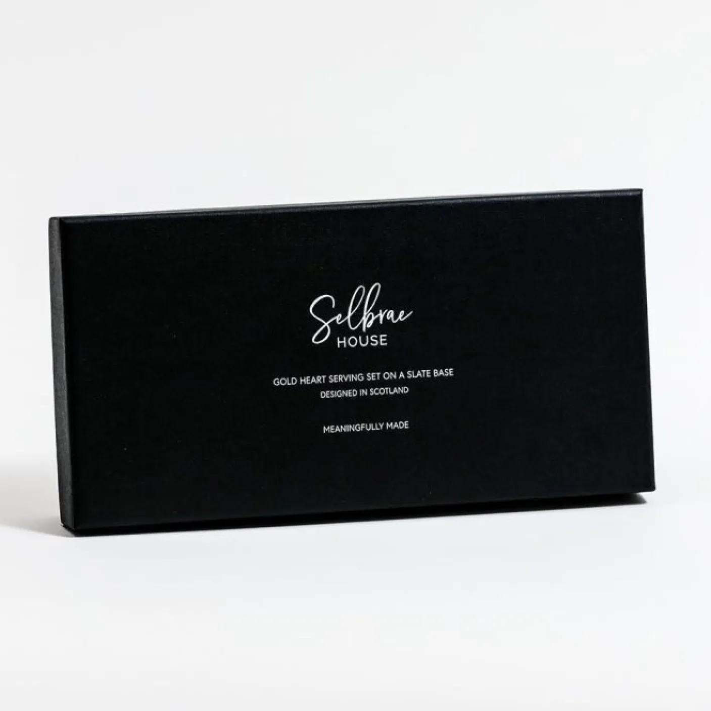This delightful heart gold serving set from Just Slate by Selbrae House is a perfect dinner party accessory. Featuring a slate base and two hand hammered, heart shaped gold interior and black exterior bowls this set is perfect for serving up a variety of dips or sauces. This sweet set would also look superb when used during a more informal gathering to hold dips or chutneys for yourcheese board. Either way this gold and slate set is sure to get attention.
