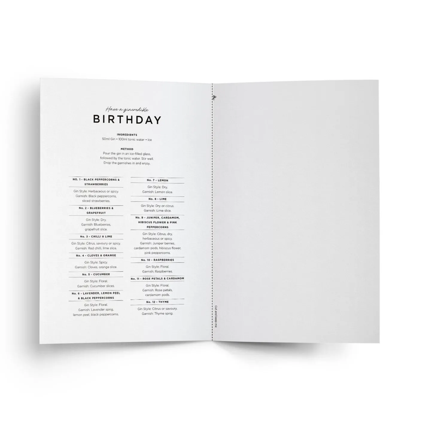 The birthday card doubles as a cut-offgin garnishrecipe guide with the ingredients and methods printed on the inside left which the recipient can use to master all 12 G&T’s. The inside right is blank for your handwritten note. The perfect keepsake for the ginlover in your life.