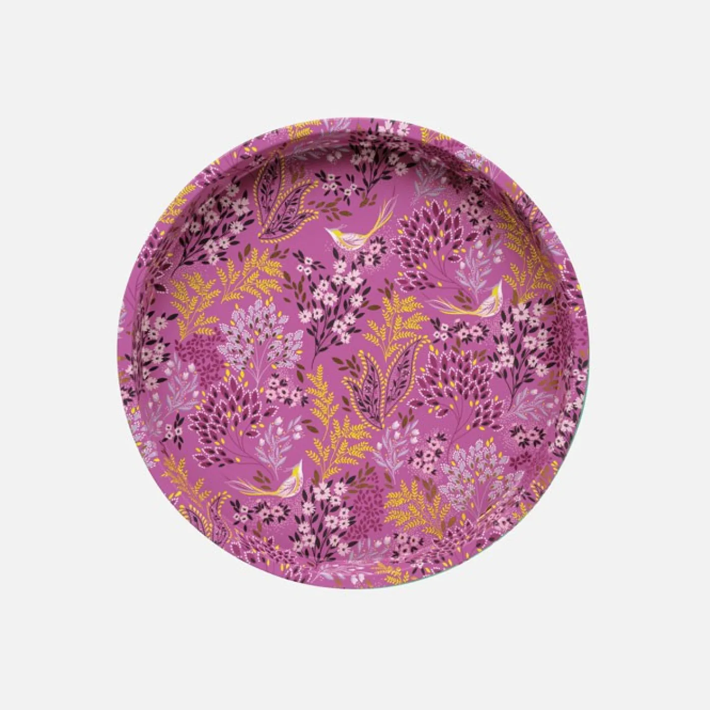 Ideal for serving up coffees and nibbles, or as a stunning decorative accent alike, this Mauve Haveli Garden Round Tin Tray from Sara Miller London will bring elegance to any occasion. Featuring an enchanting songbird settled in an idyllic meadow of exotic tree blossoms set against a rich pink backdrop, this stunning tin tray will add an element of style and practicality to your decor.
