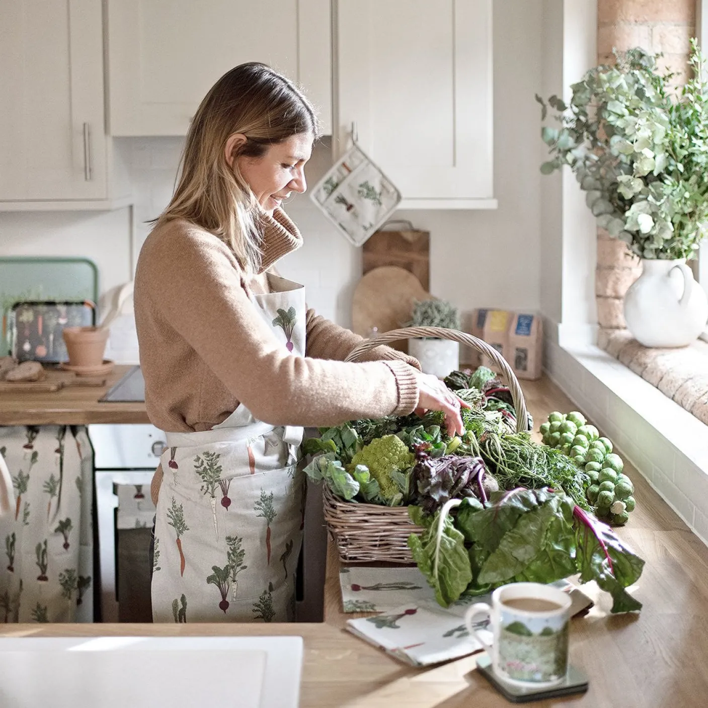 Perfect for those that love their homegrown foods and wholesome vegetables, this adult apron features our favourite seasonal vegetables with parsnips, carrots, turnips and beetroot on a pale linen coloured background. Made from 100% cotton, this lovely apron has a practical front pocket and an adjustable neckstrap.Keep your clothes free from baking mess and protect yourself from cooking spillages with this wonderful Home Grown apron.