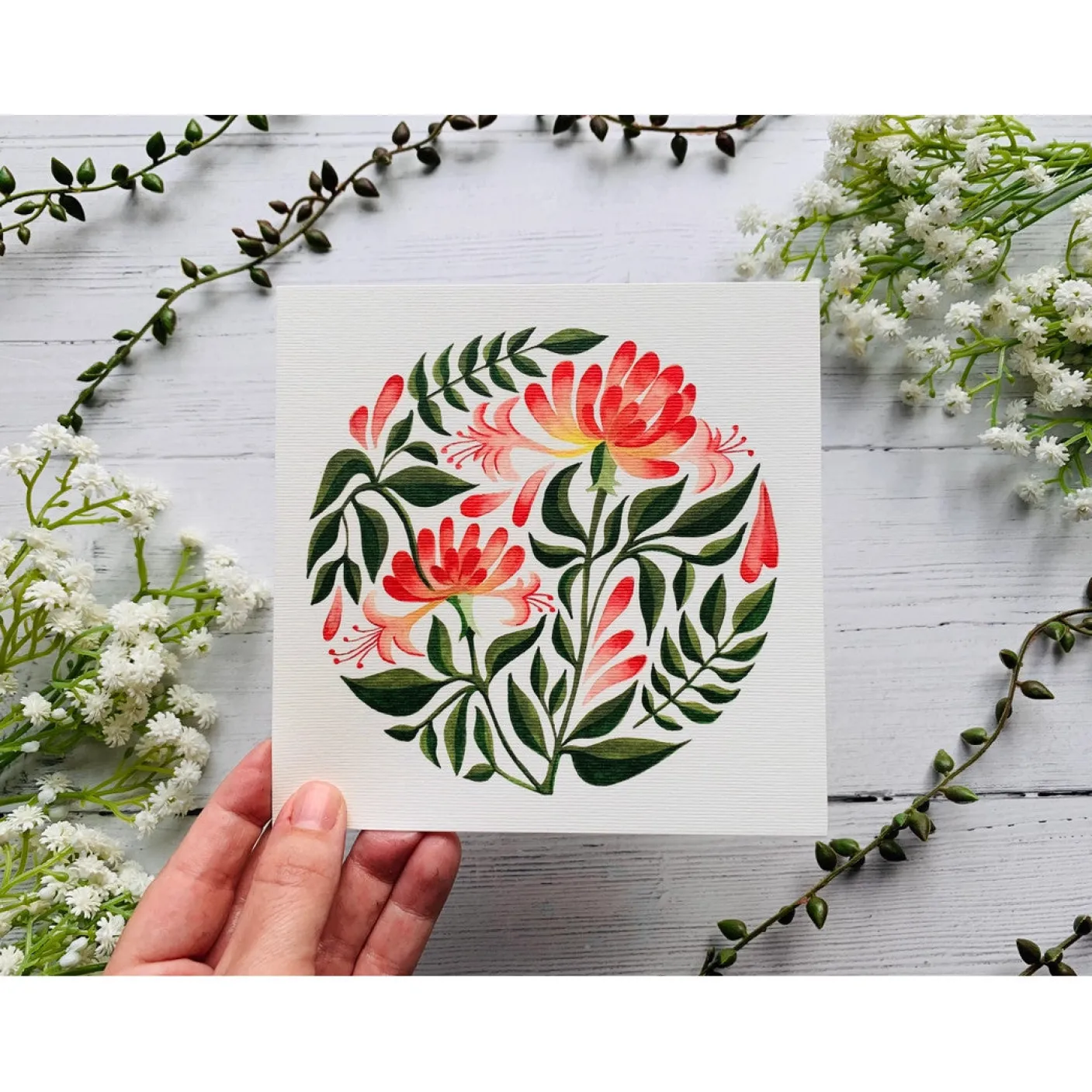Send someone a message with this watercolour honeysuckle greeting card! Featuring a pretty pink and green design, a reproduction of an original watercolour painting, this would be the perfect card for any occasion.