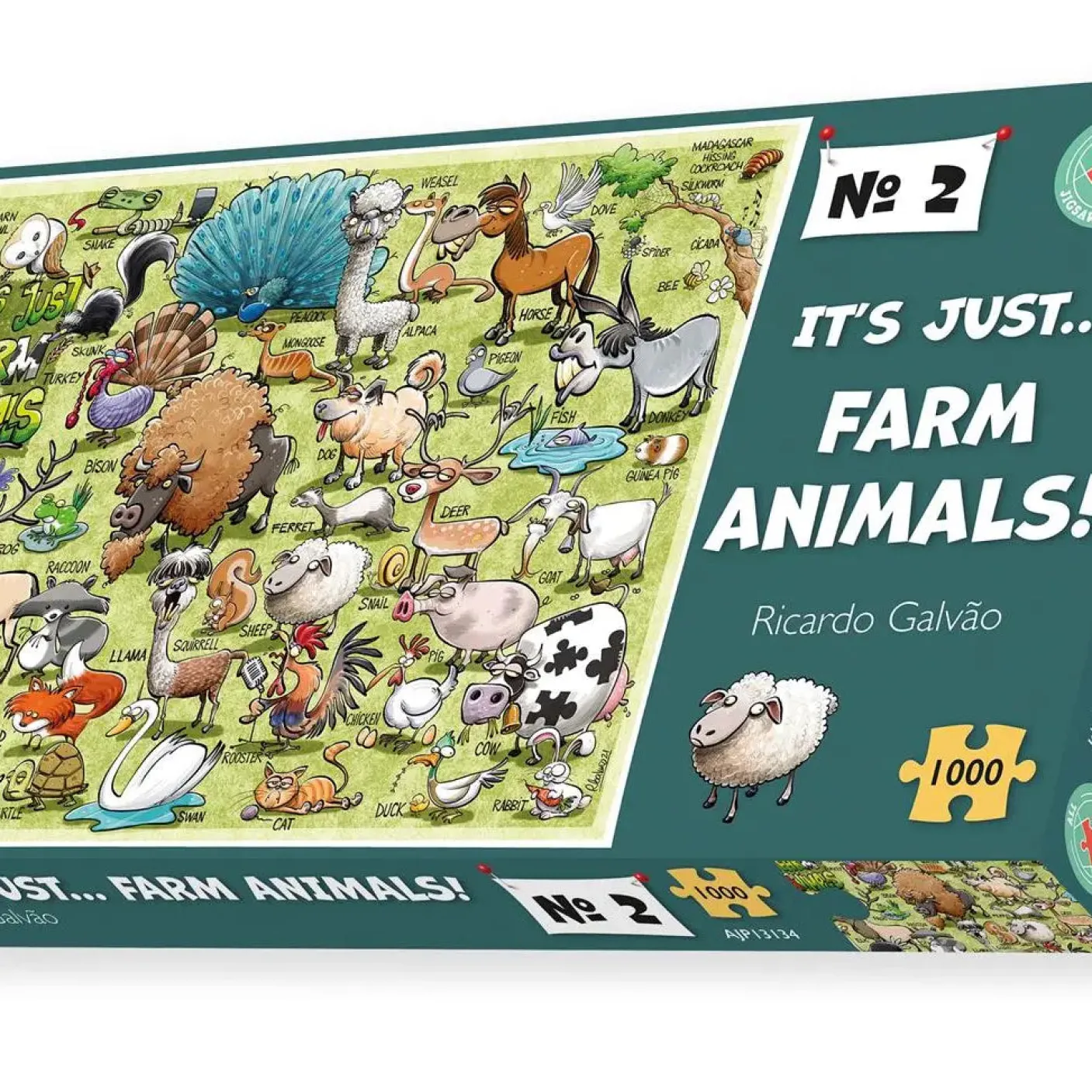 ‘It’s Just… Farm Animals’ is a fun, 1000 piece cartoon jigsaw puzzle, illustrated by Ricardo Galvao and part of the ‘It’s Just…’ range. Featuring farm animals from all around the world! From Cows and Ducks to Bison and Elk, and even a cheeky racoon! You’ll love piecing together this cartoon jigsaw of farm animals found in different parts of the world. Illustrated by Ricardo Galvao (creator of the popular ‘Chaos’ range)
