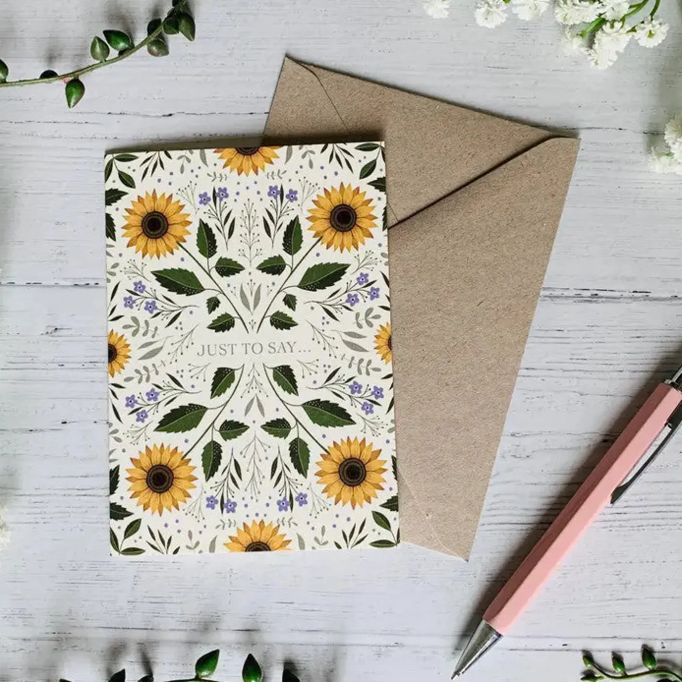 This A6 blank greetings card features the words “Just to Say…”, and has a beautiful Sunflower and Forget-Me-Not flower border. Perfect for any occasion! Left blank inside for your own message. Luxurious textured 280gsm Acquerello paper