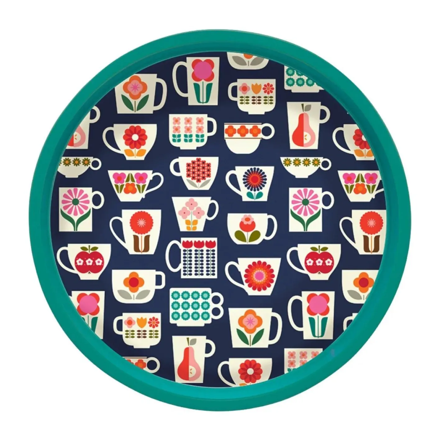 Get your tea party started with the Tea Cup Round Tin Tray by Kate Rhees. Its bright and retro design adds a fun touch to serving your favorite afternoon tea and biscuits. Perfect for any tea lover!