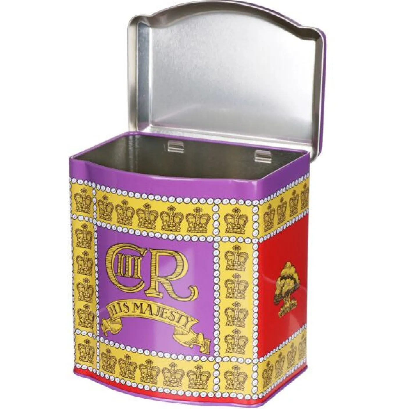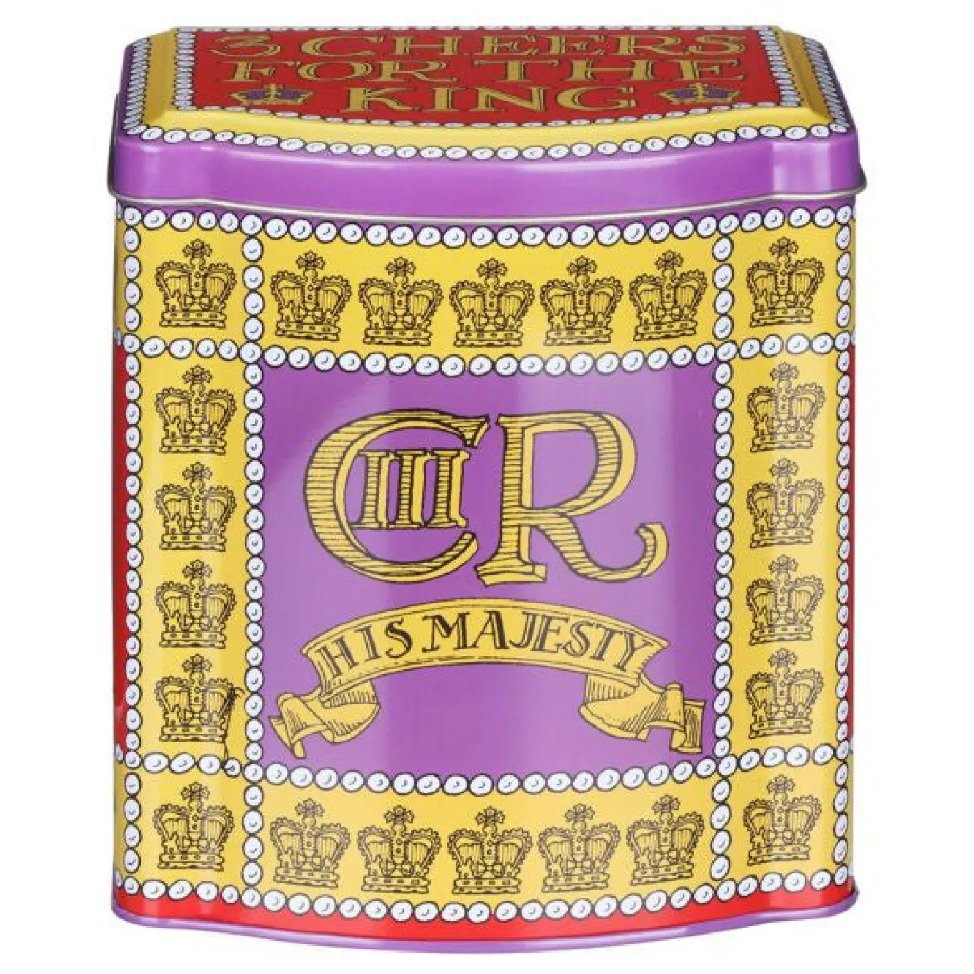 Made from metal, this caddy depicts the King’s cypher‘C III R’and the text‘His Majesty’on the front of it in gold, against a regal purple background. Surrounding this is a border of gold crowns. The lid features the text ‘3 CHEERS FOR KING CHARLES’in gold, against a red background. This elegant piece will fill your home with royalty, the perfect way to commemorate such a momentous occasion as the crowning of a new King.