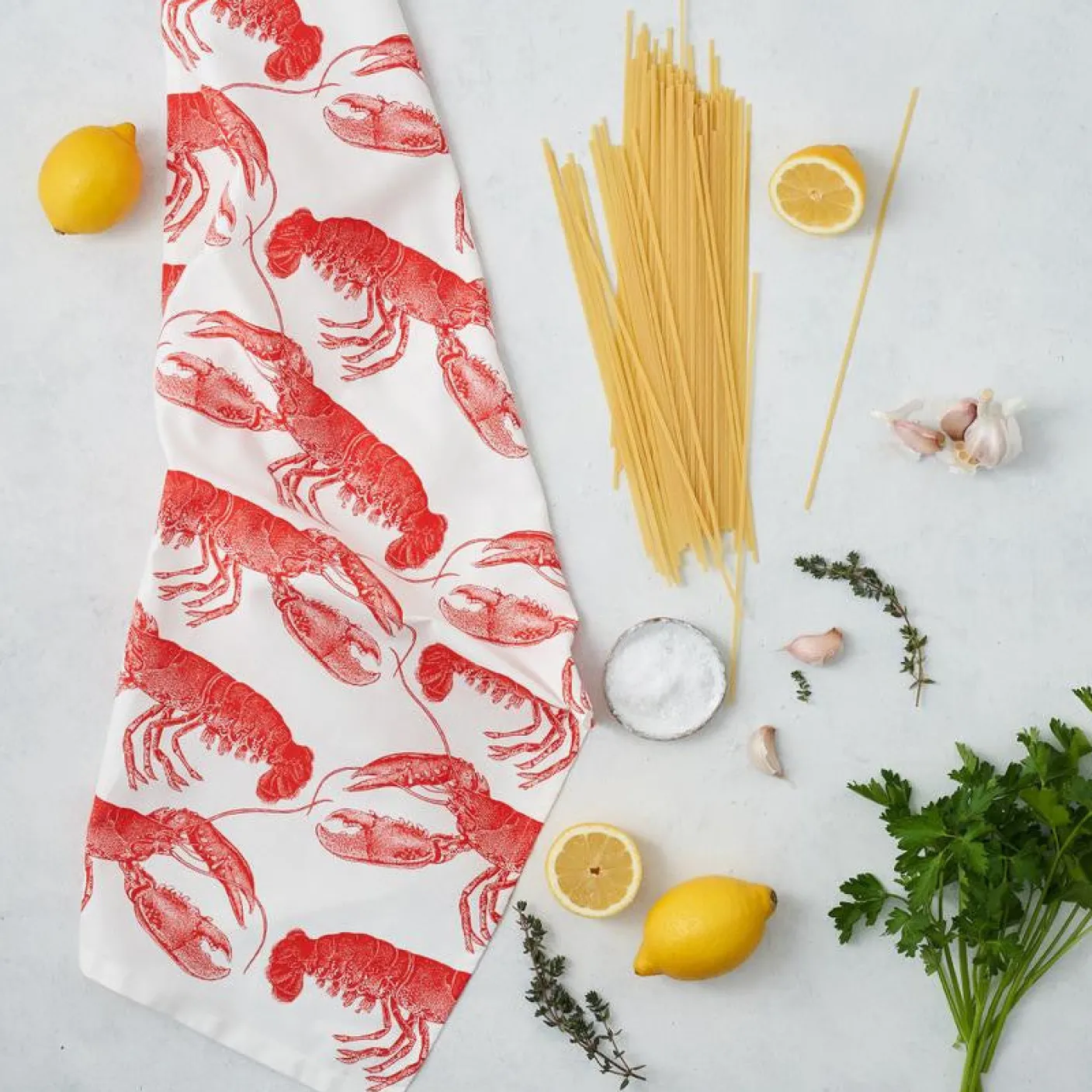 100% white cotton tea towel printed with vibrant coralred lobsters. A perfect addition to the designer kitchen and a great gift for the gourmet chef.