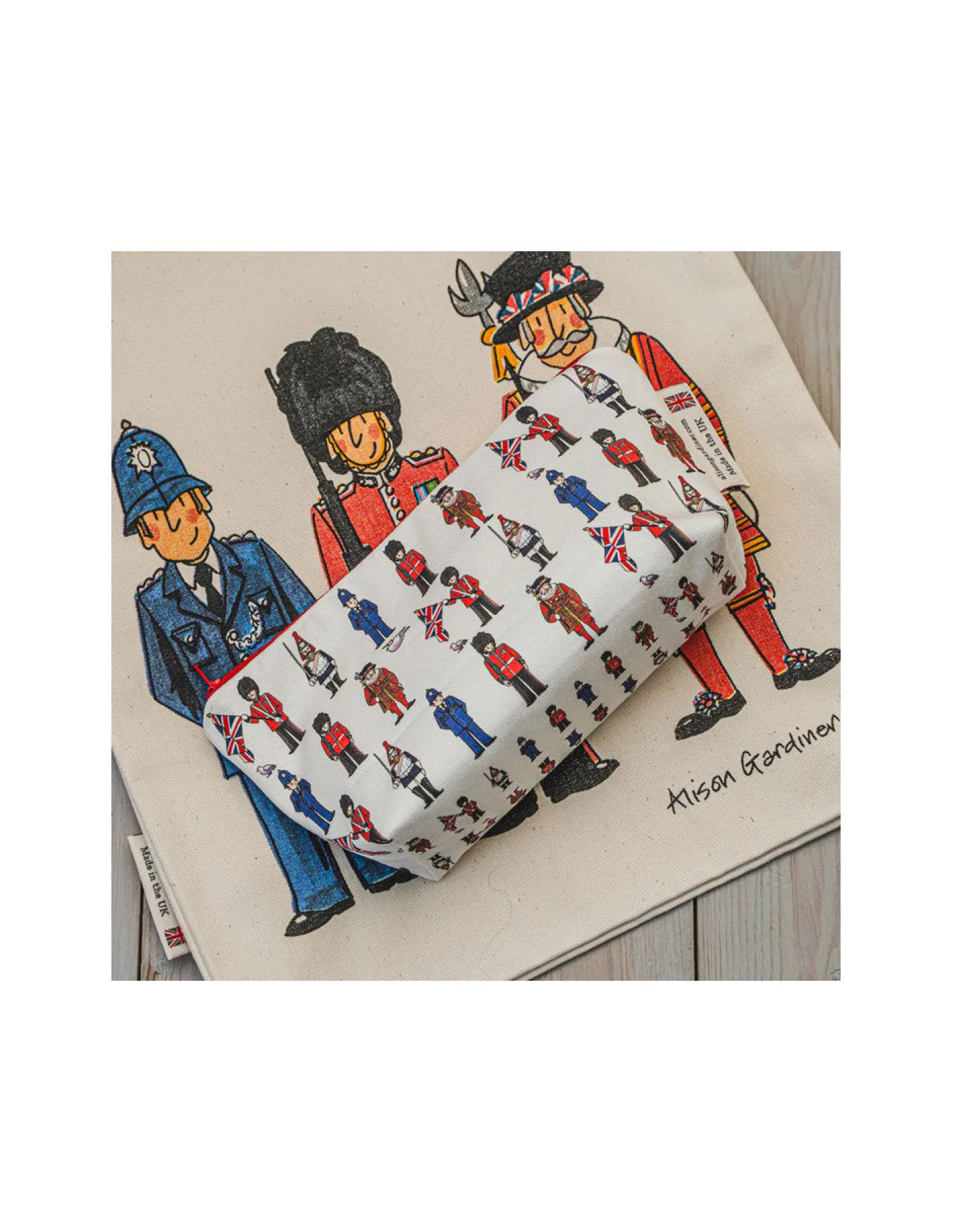 The London Figures cosmetic bag features a row of iconic British characters- a soldier from the King’s Guard wearing a bearskin cap, Beefeater(also known as a Yeoman Warder), Blues and Royals soldier from the Household Cavalry, Policeman and pigeon! This cosmetic bag is perfect for toiletries or pencil. Each side of the bag has a different image.
