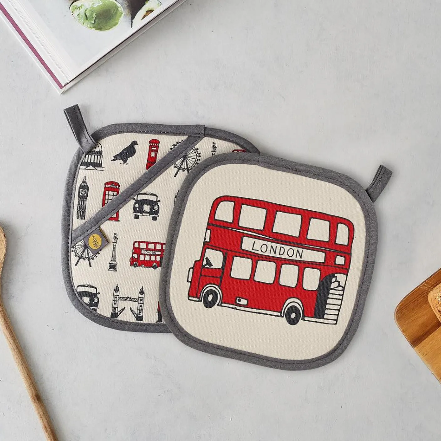Printed on one side with classic London icons, and on the other with a bold red London double-decker bus,these London pot grabs will brighten up your kitchen and keep your hands protected from hot dishes.