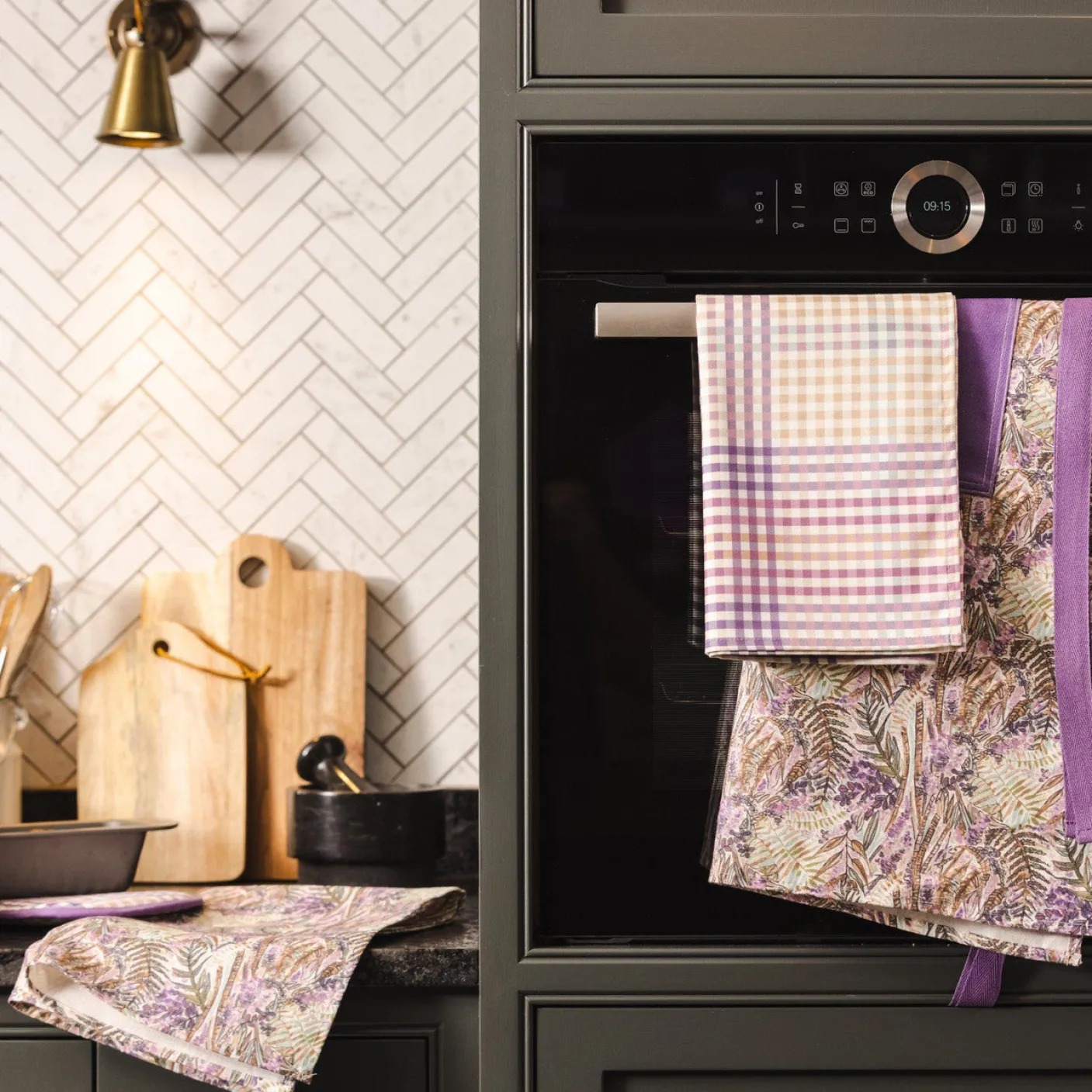 Inspired by the by the foliage of the dramatic Mourne Mountains, this Mourne Heather kitchen textile range discovers the natural vibrancy of Northern Ireland’s breath-taking landscape, in a range that amplifies colour and celebrates biodiversity.The pair of tea towels includes one in a colorful foliage pattern and one in a checked pattern and coordinateswith the matching oven glove and apron.