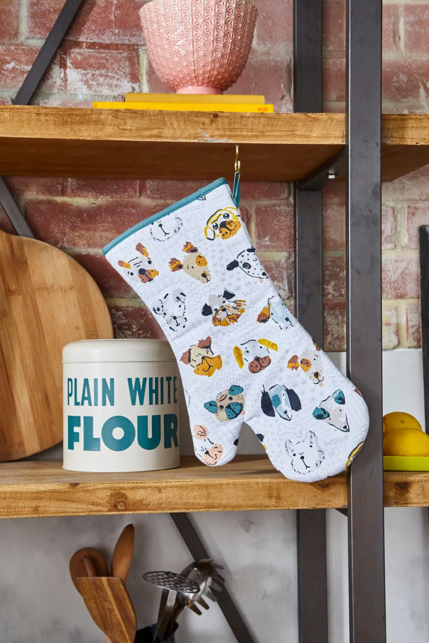 Beautiful gauntlet with adorable pups. Made from 100% cotton and special heat resistant polyester wadding filling that meets British Standard. This single oven glove gauntlet will protect you from oven heat as you take your cooking from the oven to the table. Machine washable.