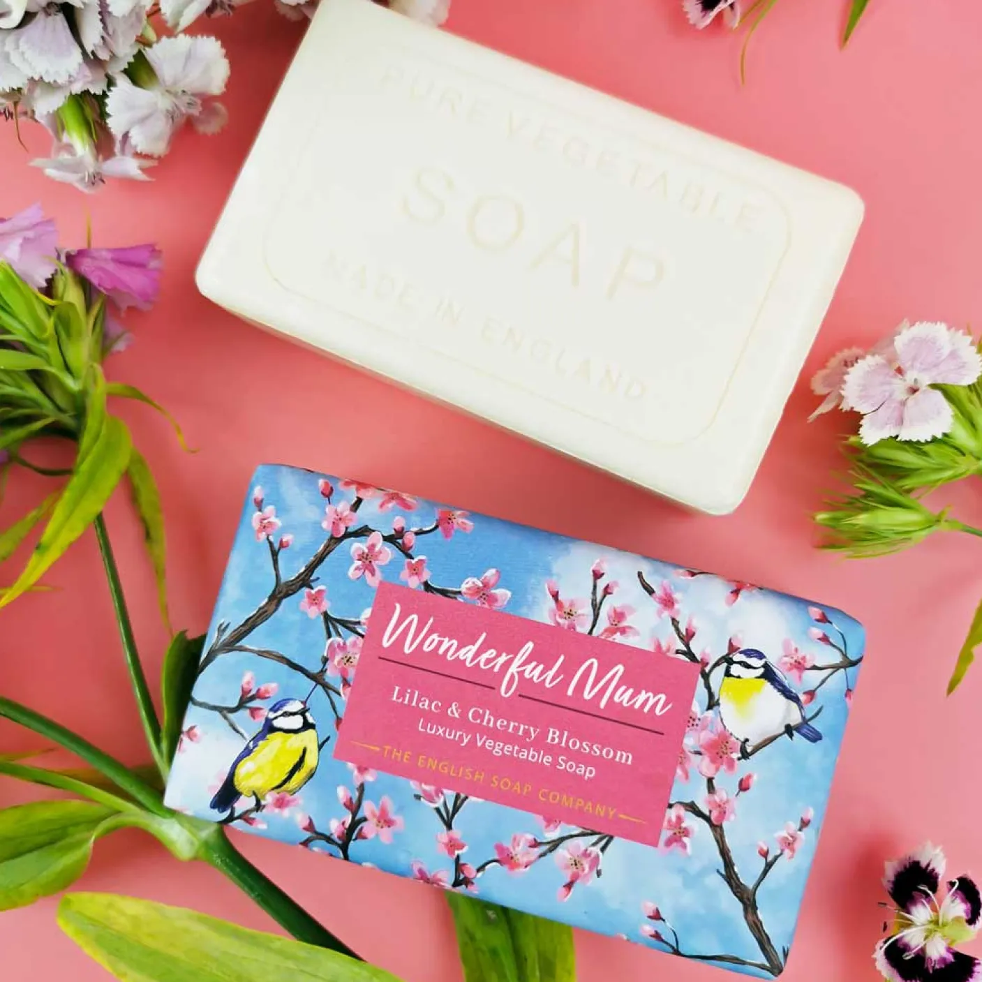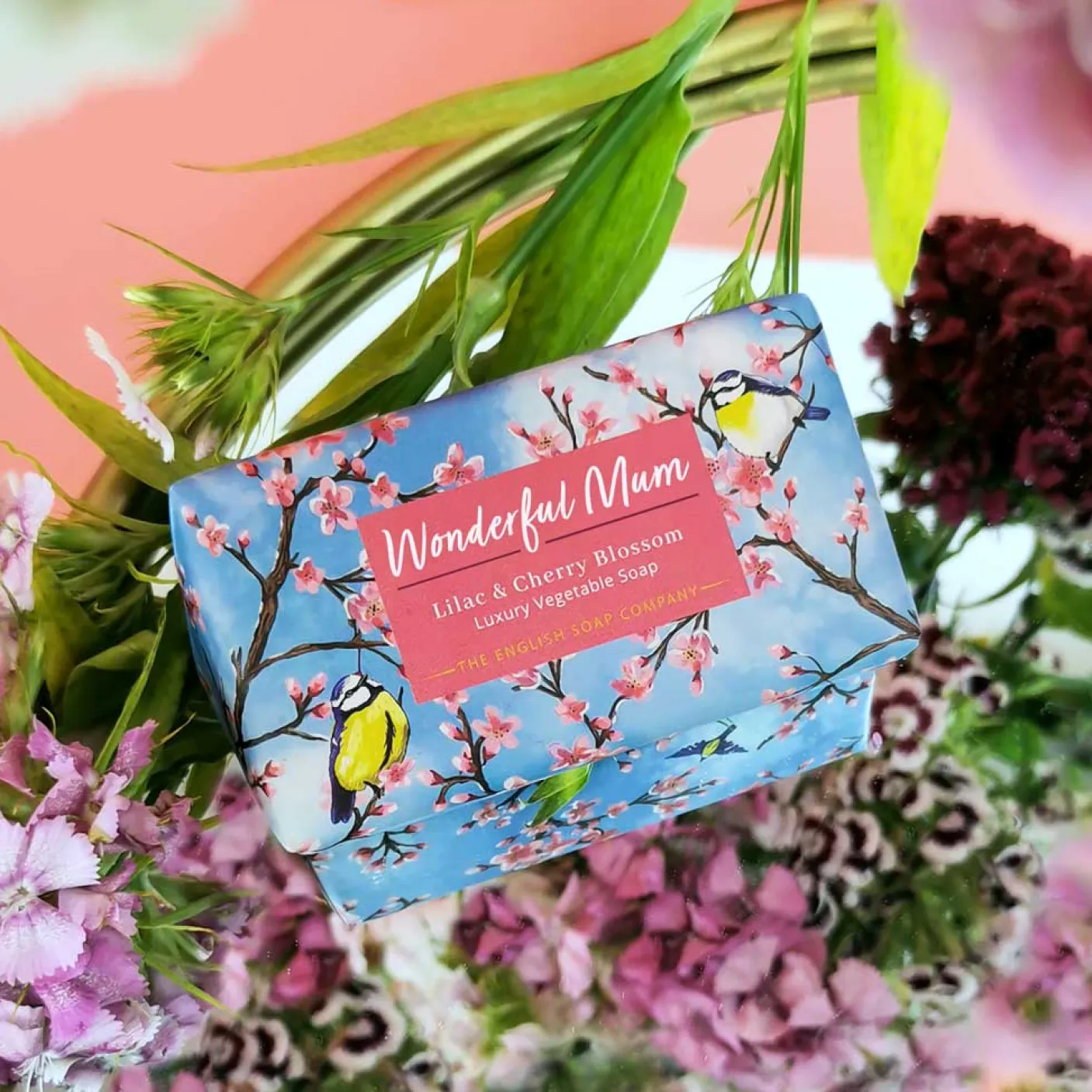Show them how much they mean to you with a vegan-friendly, luxury soap bar, printed with hand-illustrated blue tits perched amongst cherry blossoms and a ‘Wonderful Mum’ message. Made using pure vegetable oils and enriched with Shea Butter to keep skin feeling nourished. This luxury soap makes a beautiful, sustainable gift to show your appreciation and make their day.