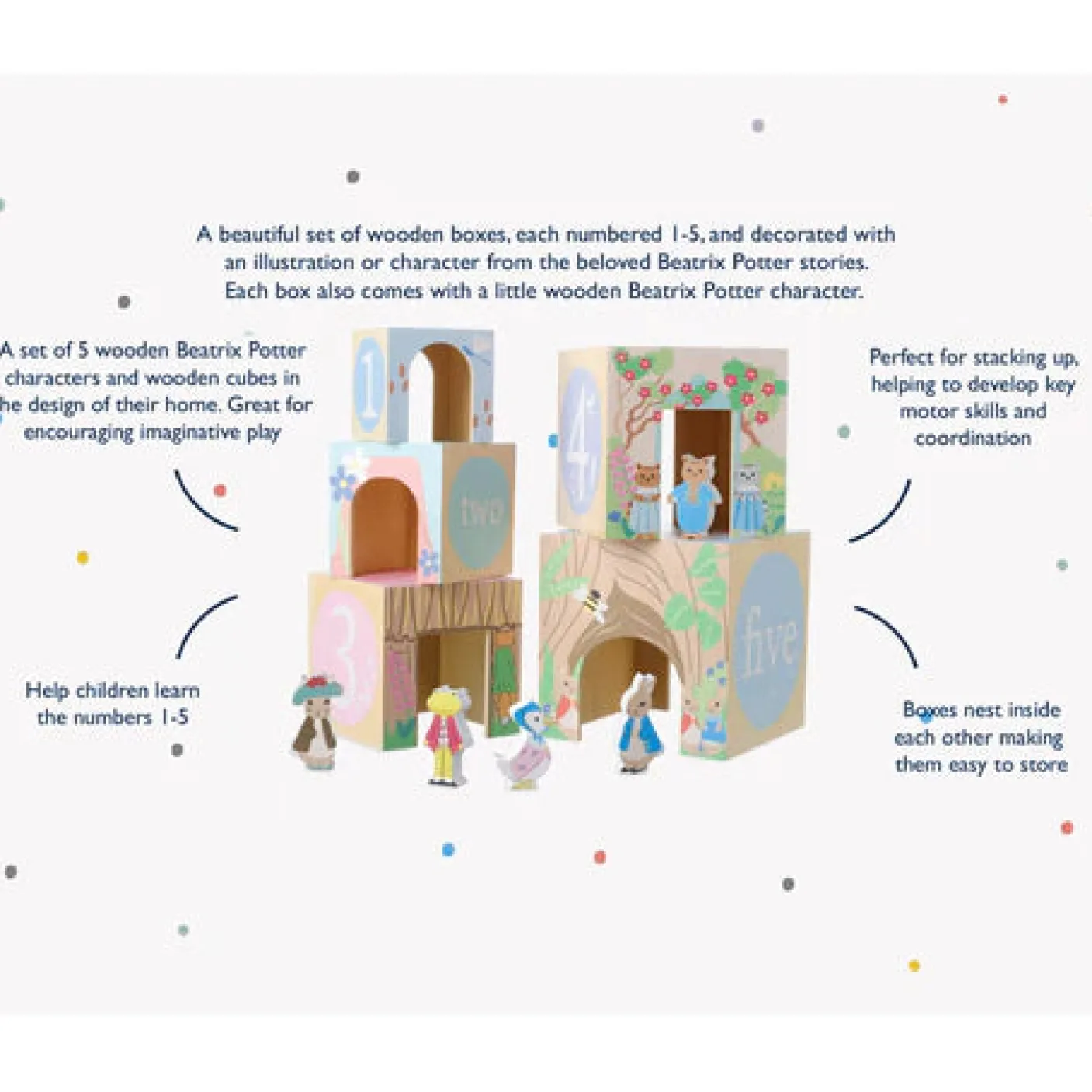 A beautiful set of wooden boxes from Orange Tree Toys, each numbered 1-5, and painted in the design of a Beatrix Potter character’s home or hiding place! Each box also comes with a little wooden character.