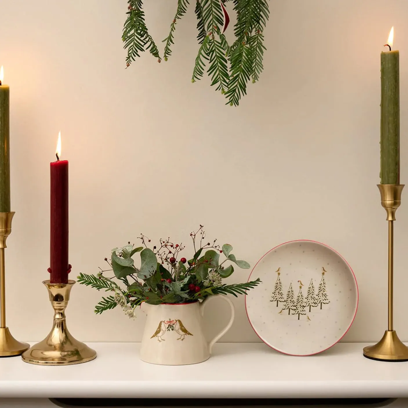 Perfect for serving your mince pies, this lovely stoneware side plate is dotted withadorable plump Robins perching on top of Christmas trees with one Robin holding a sprig of mistletoe against the snowy neutral background and contrasting red rim. Measuring 20cm in diameter, this lovely plate makes a wonderful small canape plate or side plate for any stylish Christmas table setting.