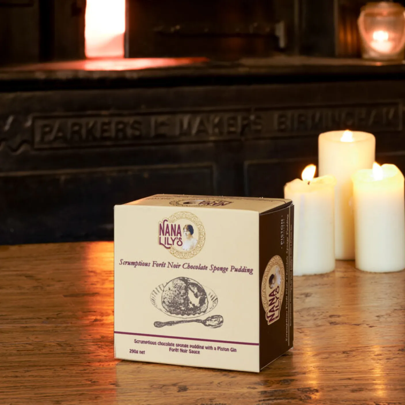 Scrumptious moist chocolate sponge pudding with the flavorsome Piston Forêt Noir gin in the chocolate sauce. Treat the family with this delicious pudding from Nana Lily’s. Made inEngland.
