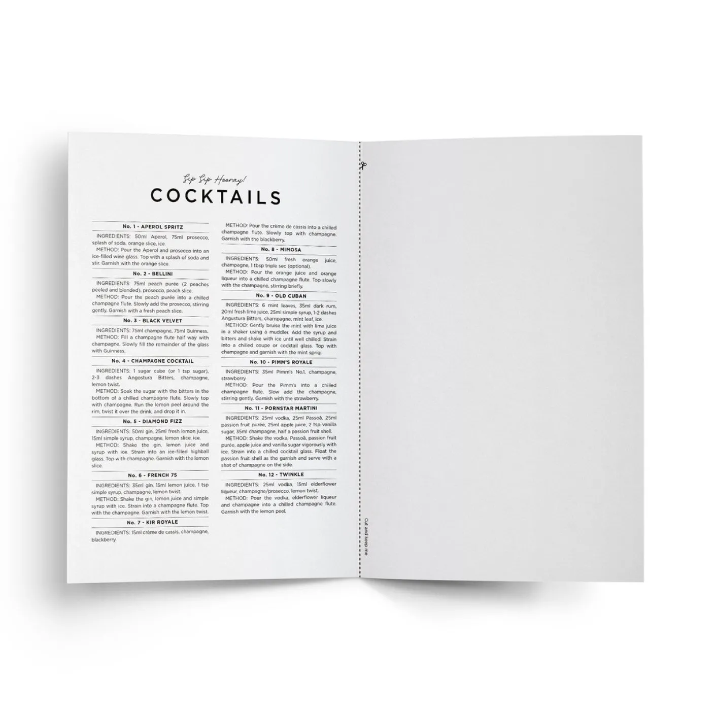 - Ingredients and method for all 12 cocktails printed inside.
