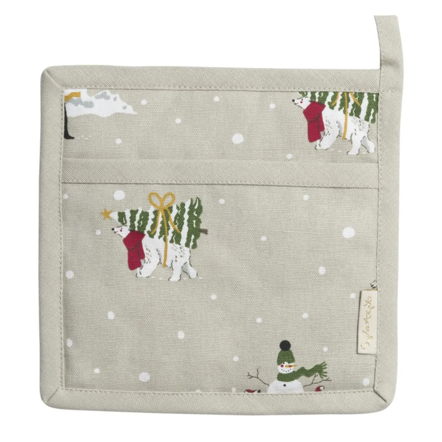 Astylish and useful kitchen essential and perfect for adding some Christmas cheer to your home, this practical pot grab featuresSophieAllportcharming Snow Season design. Adorablepolar bears and their cubs, artic hares and penguins are all wrapped up warm in scarves and Santa hats playingaround the Christmas trees, skiing, building snowmen and carryingpresentson a snowy warm neutral background.This hard wearing pot grab is made from 100% cotton and has internal padding for excellent heat-resistant insulation toprotect your hands while lifting hot pans and dishes.