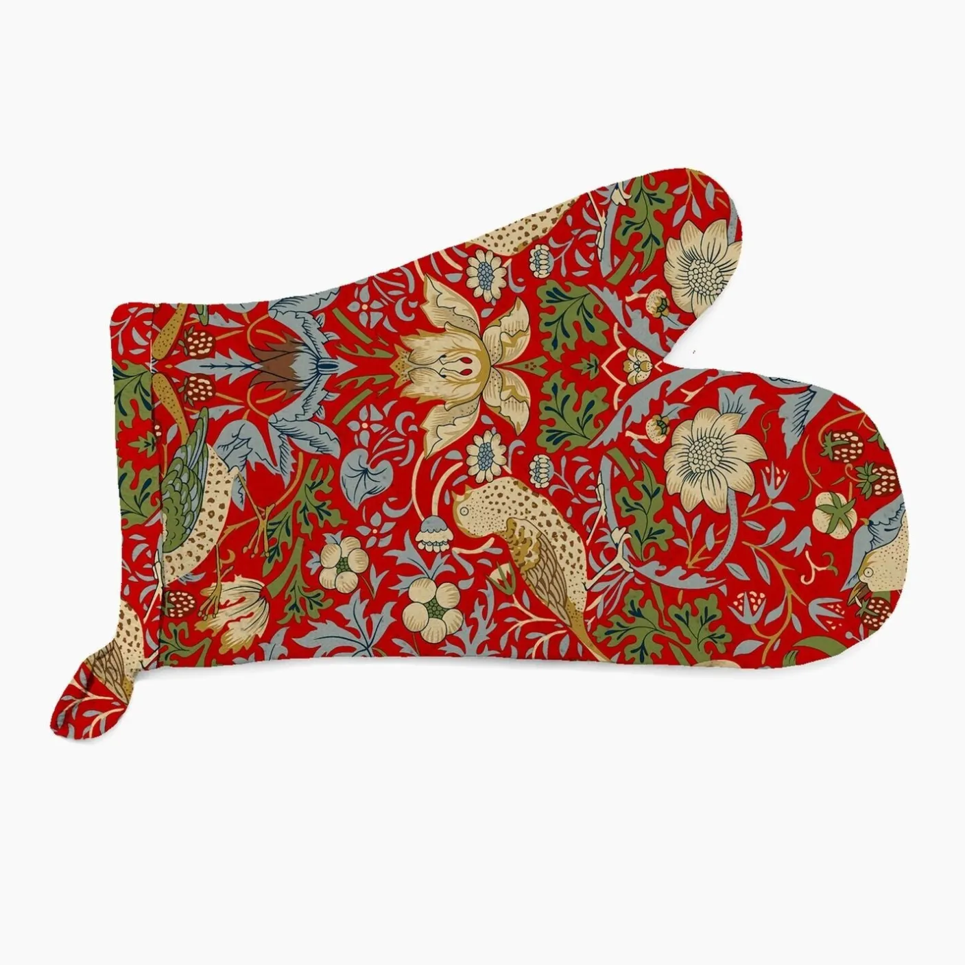 Keep your hand safe with this oven mitt from William Morris. This gauntlet features Morris’ Red Strawberry Thief design.