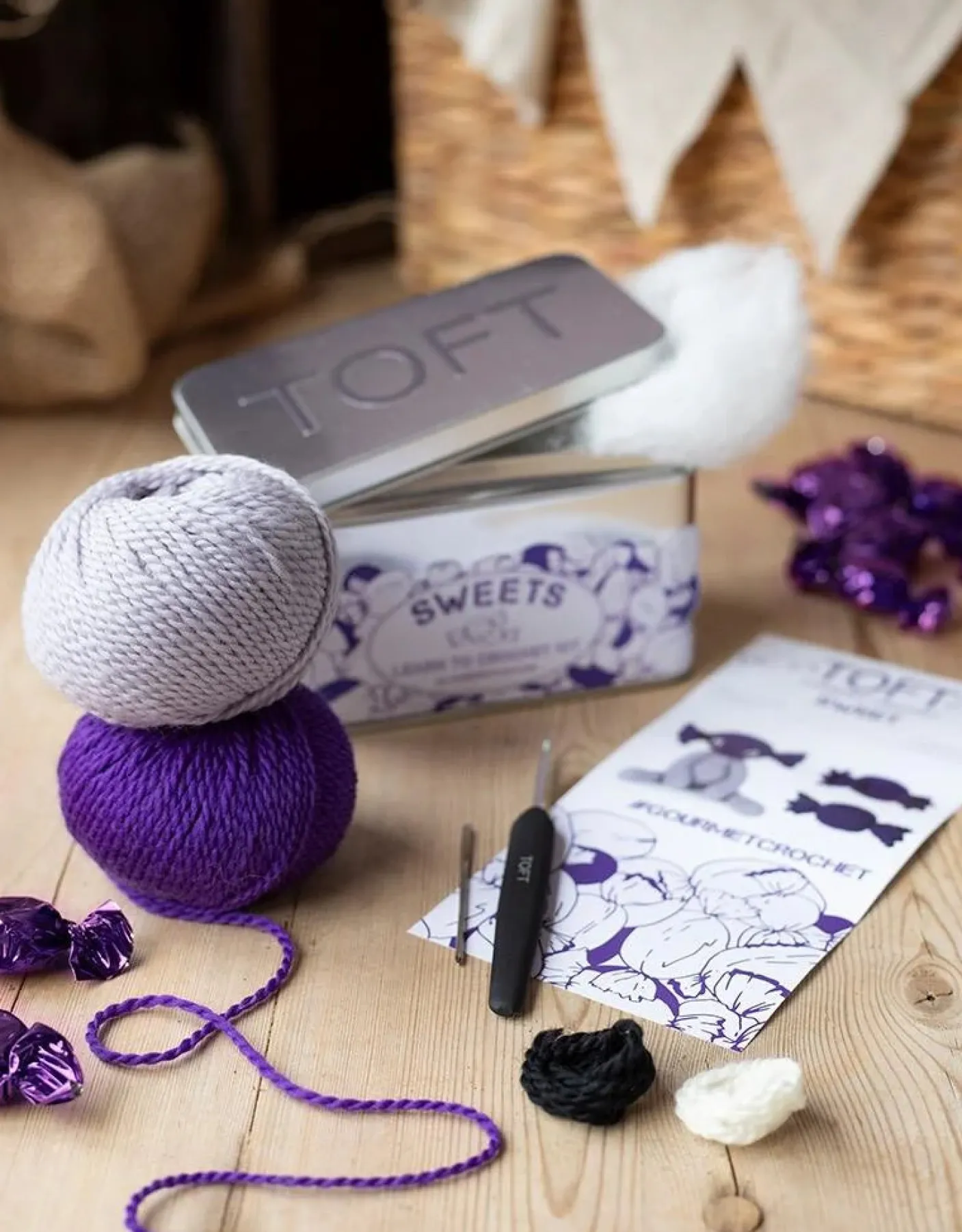 Introducing TOFT’s hand-crafted range of crochet confectionery, perfect for gifting and packed into a collectable keepsake tin, for storing your tools and notions inside, or for forming part of a play kitchen when gifted with crocheted food inside. This delicious gourmet crochet kit includes the yarn to make one cute Sweetie character or four individual sweets for a plateful of play food. Whether you are looking to indulge yourself or a loved one, this tin of goodies is sure to delight the senses.