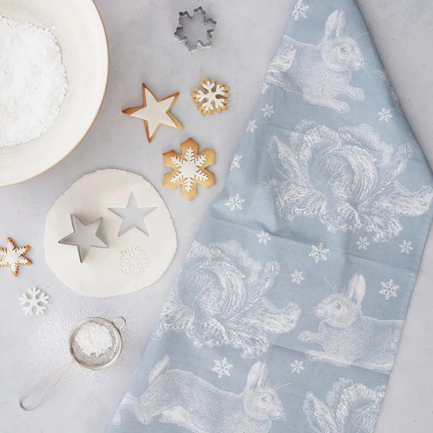 100% White cotton tea towel, screen-printed with a fabulousWinter Rabbit design. The perfect kitchen addition for the holiday season.