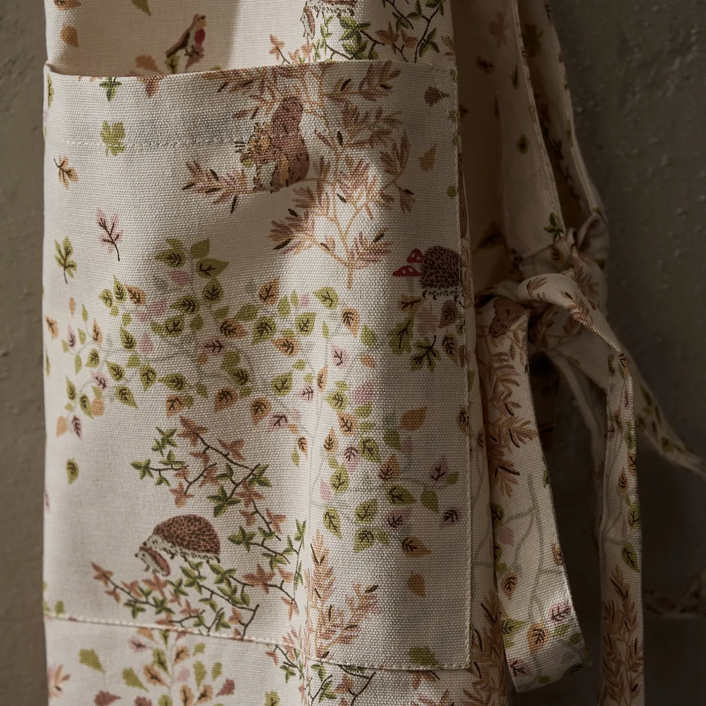 Bring woodland charm to your kitchenwith this delightful apron featuring Sophie’s Woodland Friends design on a warmneutralbackground. The design embraces playful red squirrels, sweet hedgehogs and joyful robins, while the earthy brown, orange and green leaves highlight the autumnal transition, evoking the warm glow of golden hour. This charming apron makes seasonal cooking or baking a delight.There is a handy front pocket for your baking essentials, as well asan adjustable neck strap for the perfect fit.