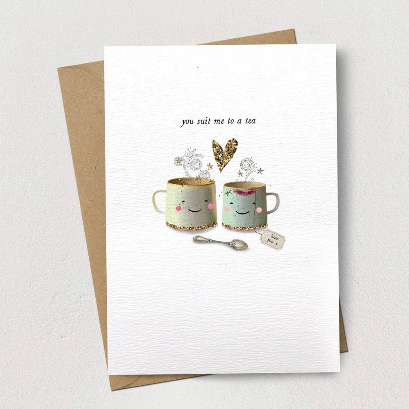 This beautiful, whimsical card by Stephanie Davies features two adorable cups of tea, decorated with sparkly details and a heart, and the text “You suit me to a tea.”