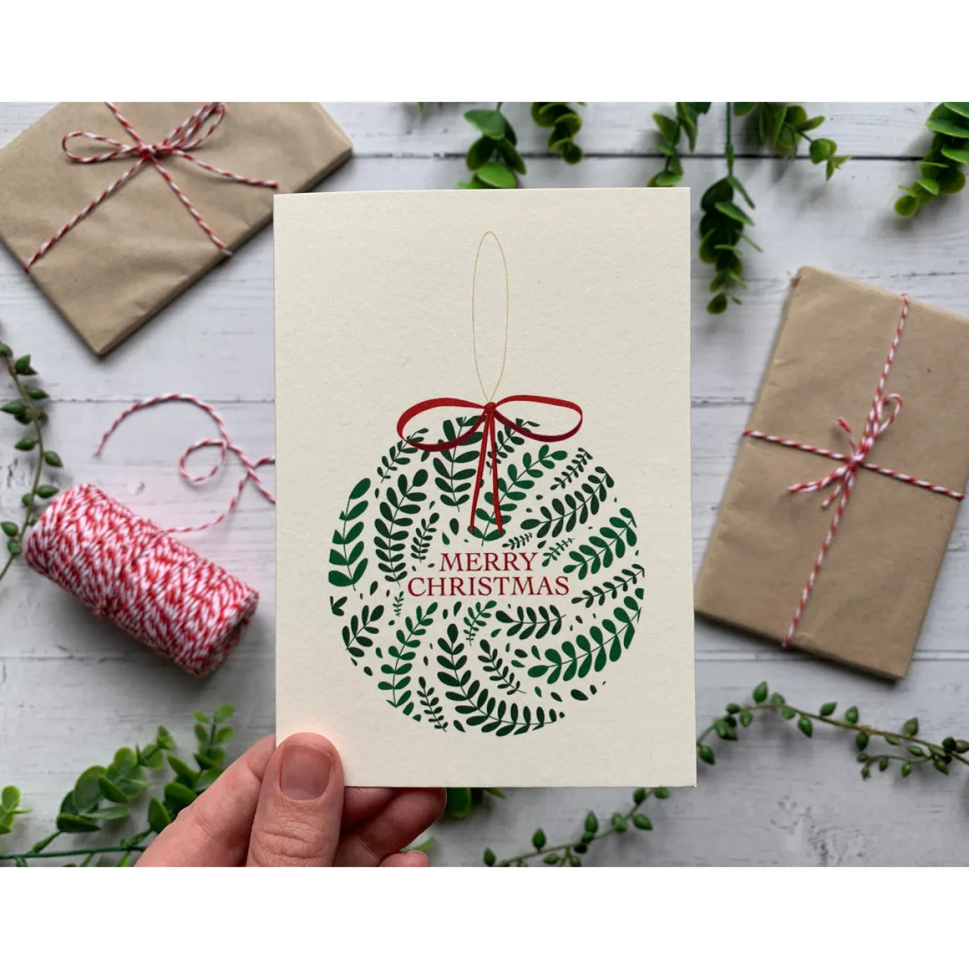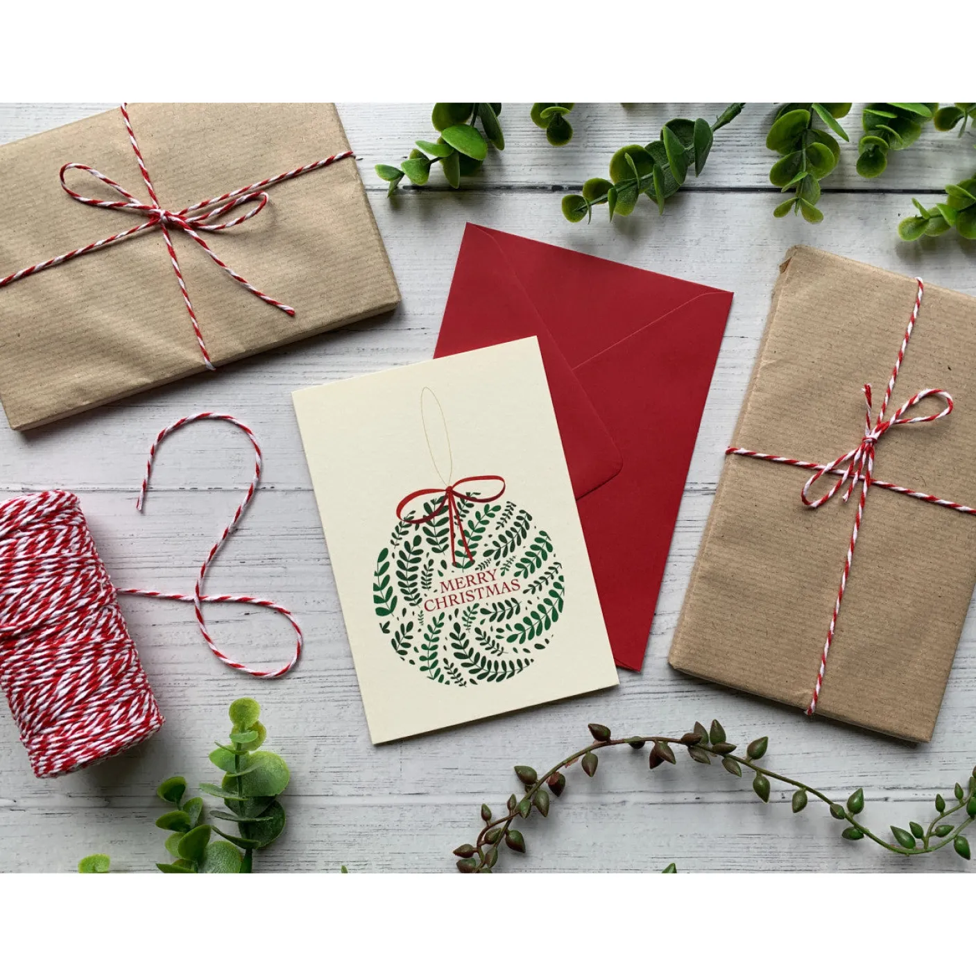 Luxury A6 Christmas card, printed in the UK on textured Aquerello paper. Each card comes packaged with a Kraft paper envelope and a compostable cellophane sleeve. Blank inside.