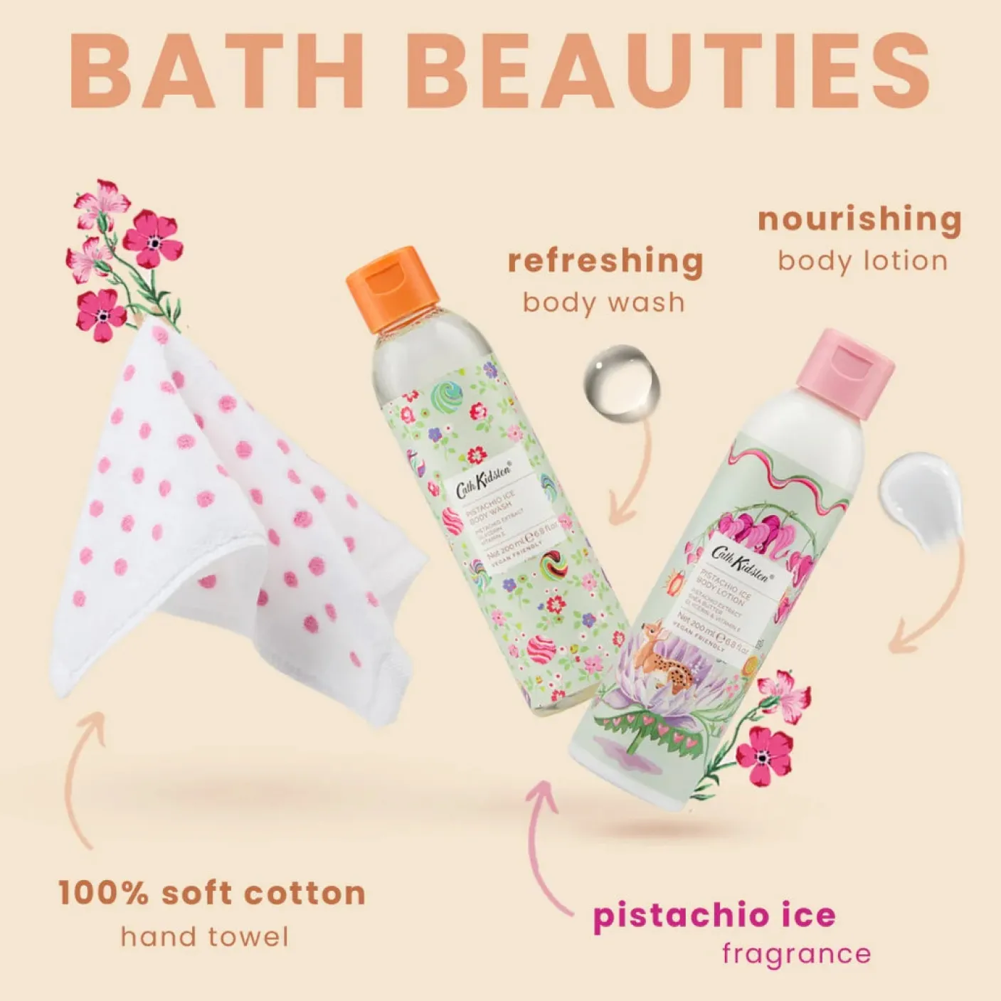 Enchanting carnival inspired gift filled with bathing goodies of gentle body wash and soft body lotion fragranced with delicious Pistachio Ice, and a classic Cath Kidston polka dot cotton hand towel.