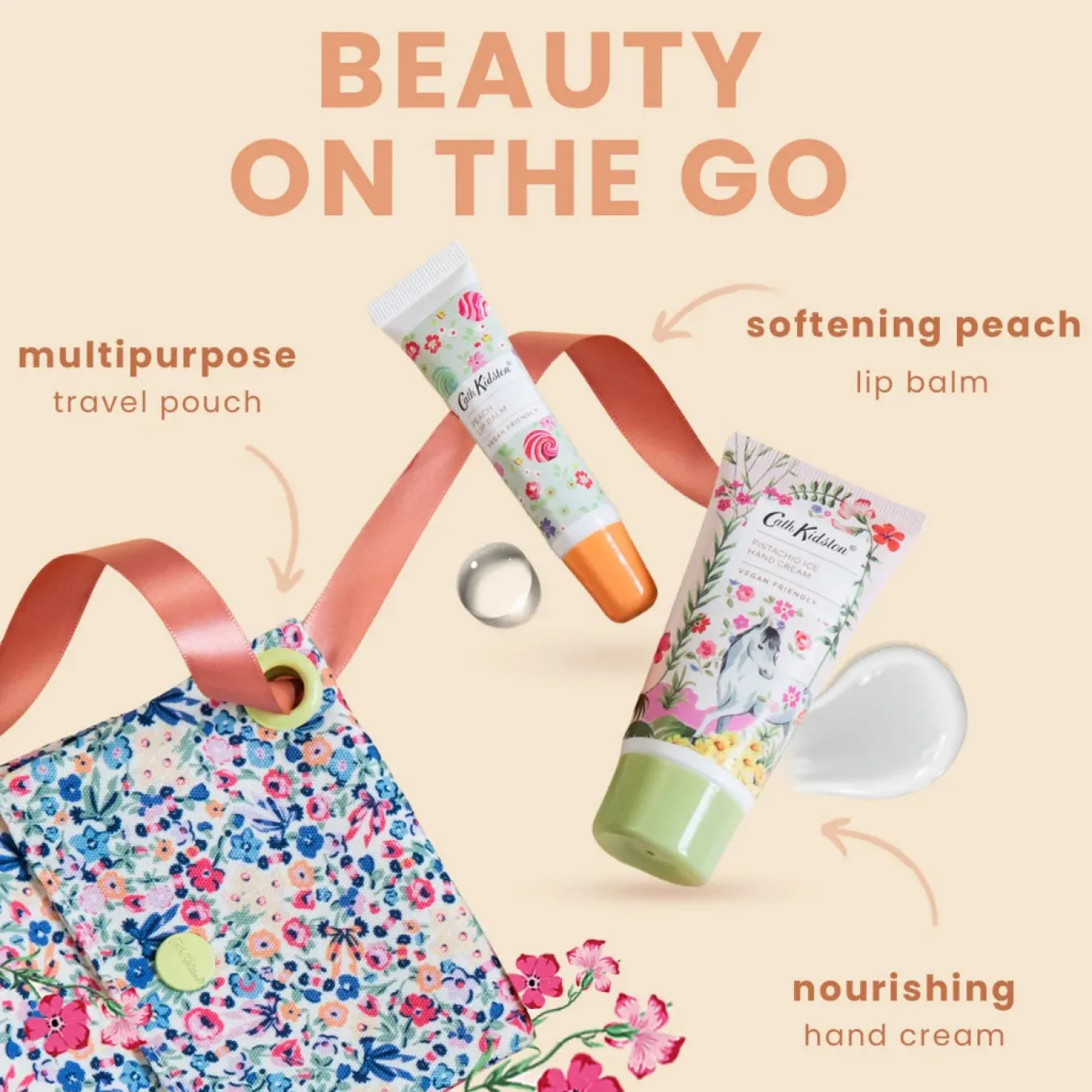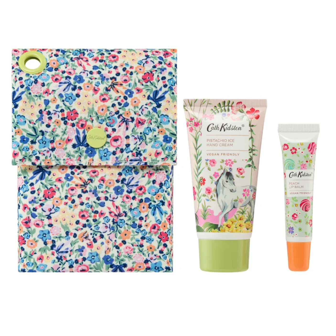 Enter the carnival spirit with our perfect gift of ditsy floral travel pouch filled with festival essentials of pocket Pistachio Ice hand cream and peach lip balm.
