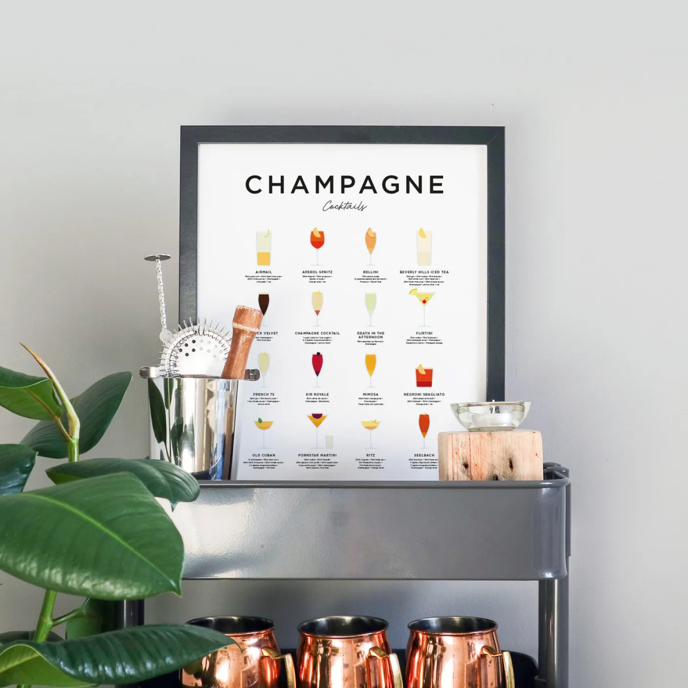 A minimalist cocktail poster featuringclassic andpopular champagne based cocktails. The poster also functions as a cheat sheet for aspiring mixologists with the illustration and ingredients for each cocktail. This cocktail poster is perfect wall art for your kitchen or living room and also makes a great gift for a champagnelover.