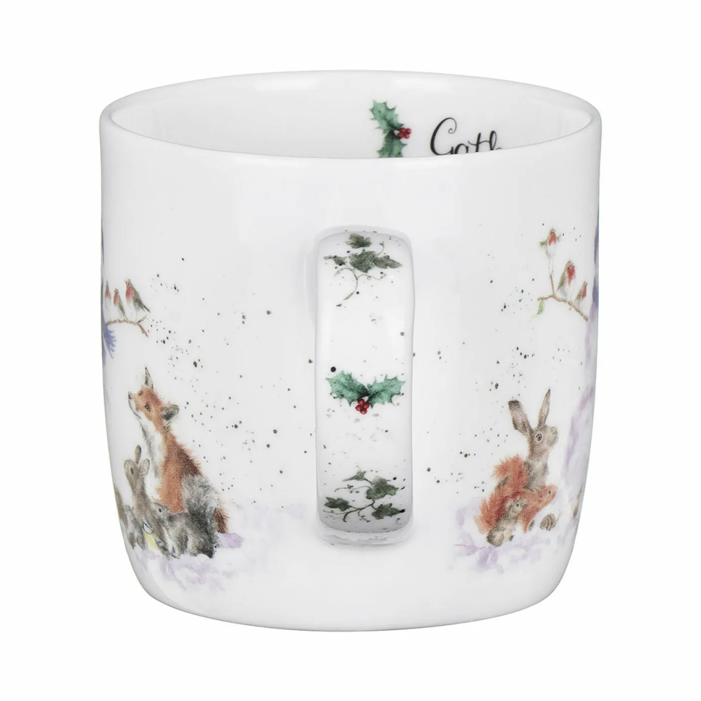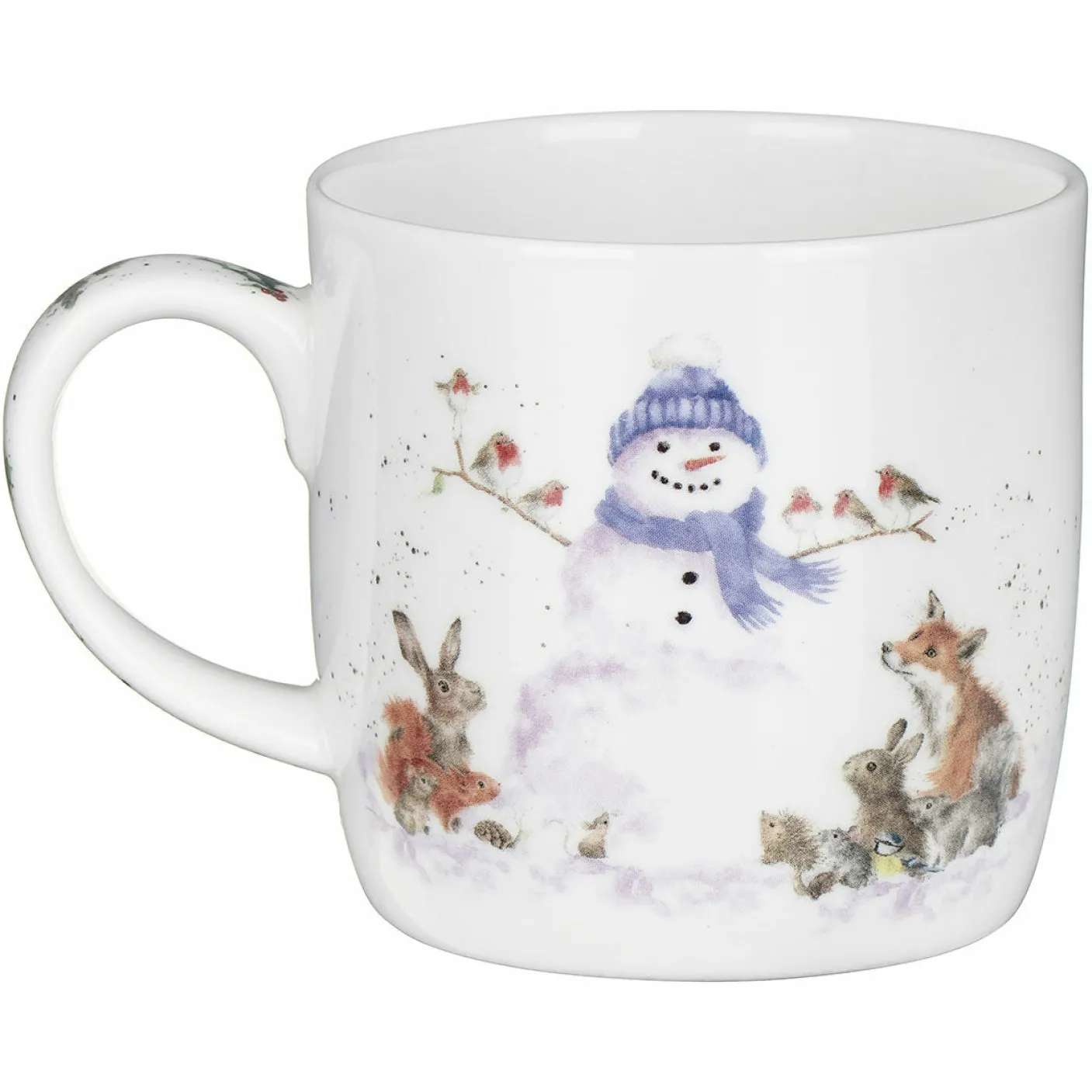 Featuring an array of cute fluffy British countryside animals all gathered around a smiling snowman dressed in a blue hat and scarf. The handle has sprigs of holly running down the outside of it and on the inside of the mug there is writing which reads ‘’Gathered all Around’’ in a swirly font.