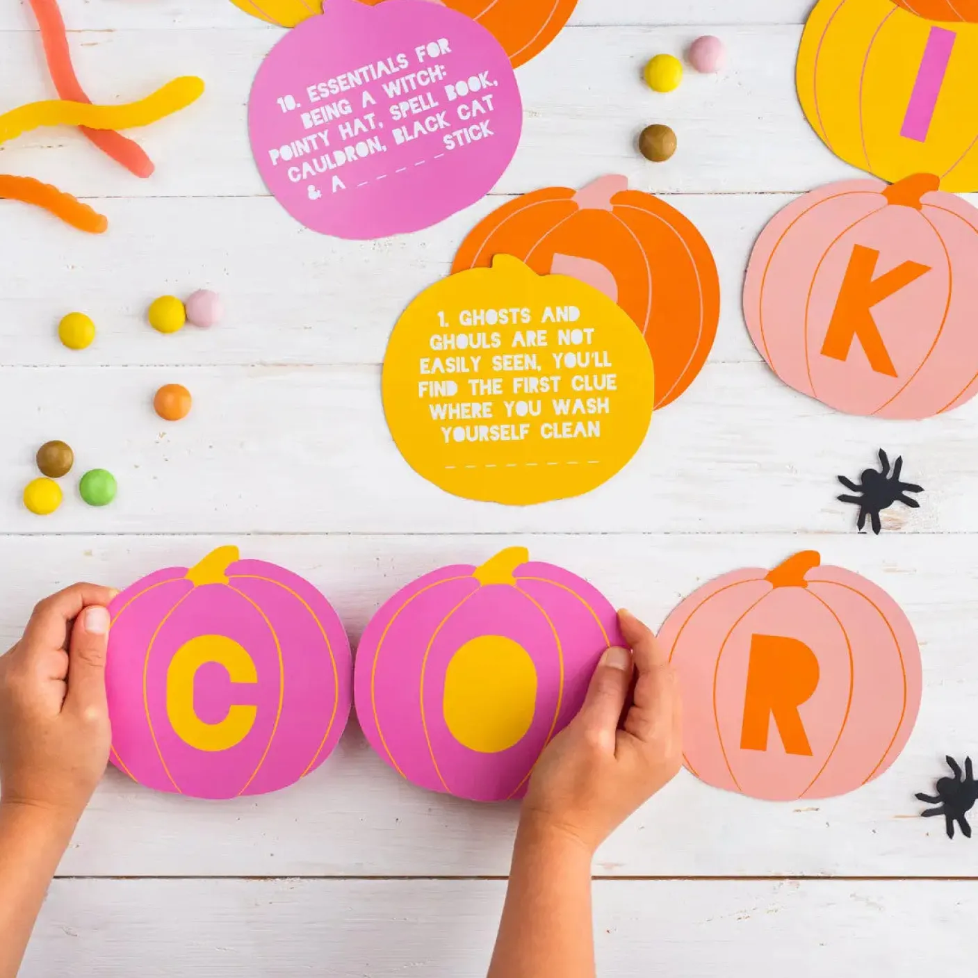 Each kit contains: 18x mini spiders, 12x treat bags, 12x pumpkin hunt clues, 5x halloween themed props, 1x instructions sheet, 1x gold foil pumpkin and a ‘what can you see’ game