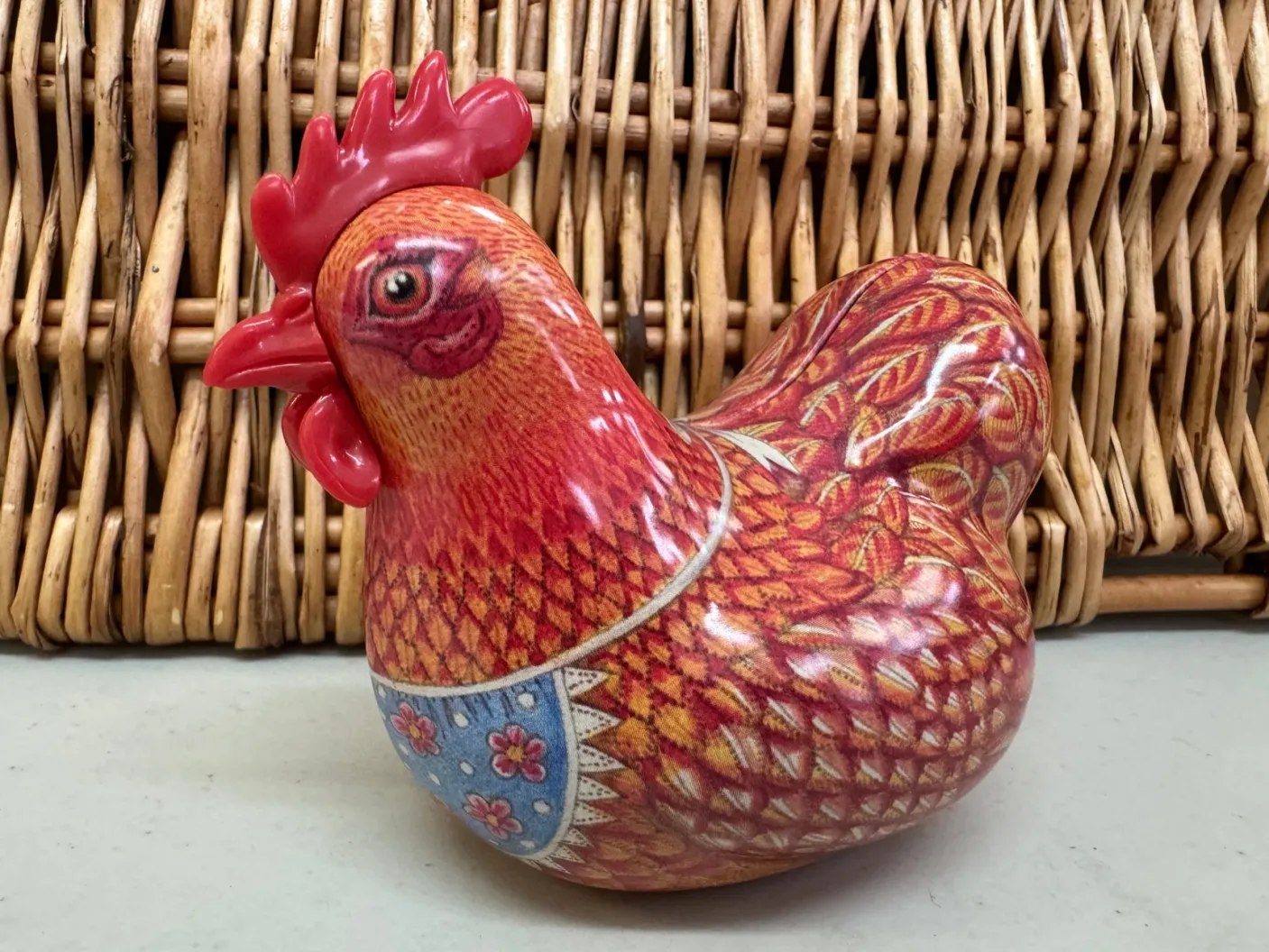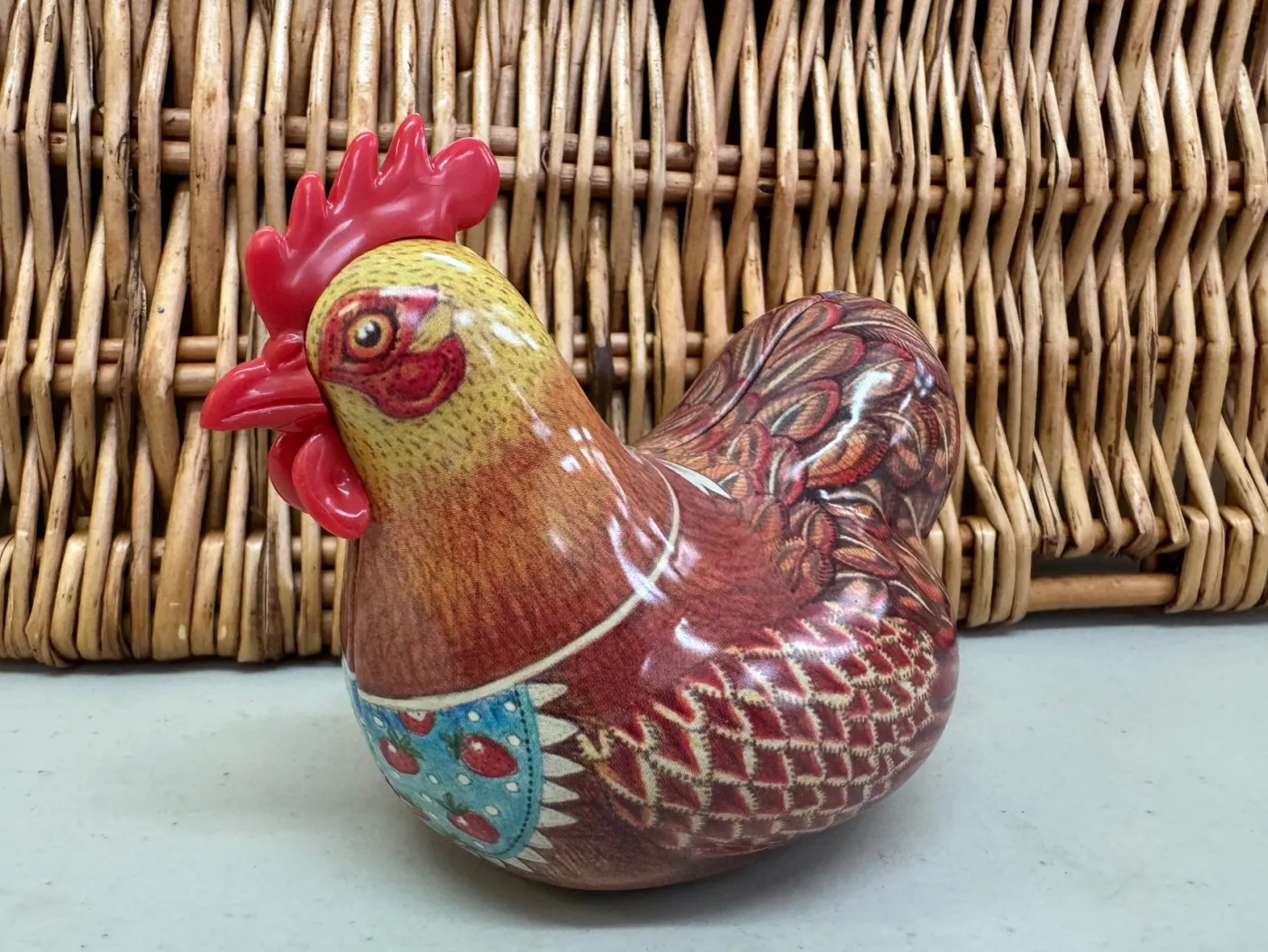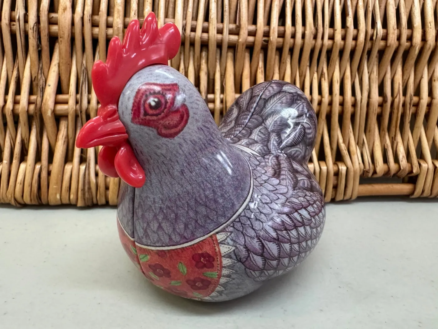 Charming hen-shaped tins recalling early 20th-century children’s book illustrations. Open up to fill with treats or secrets! Select one of 4 varieties.