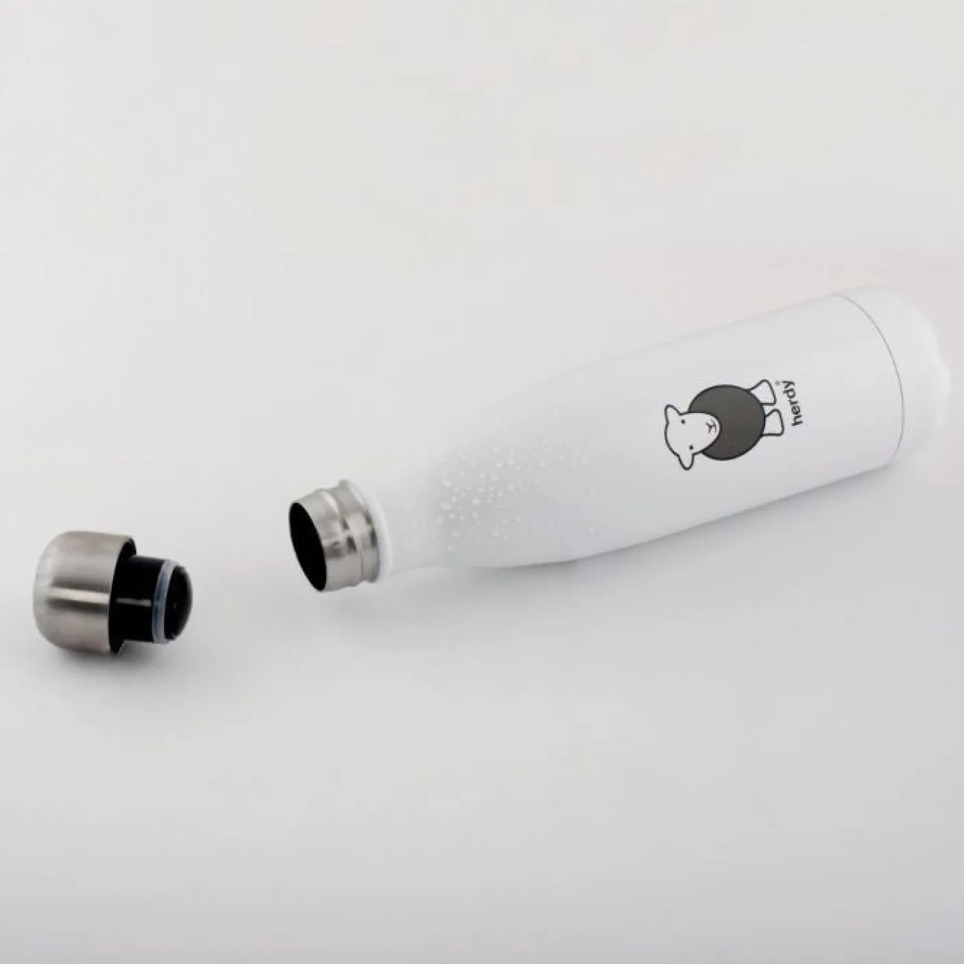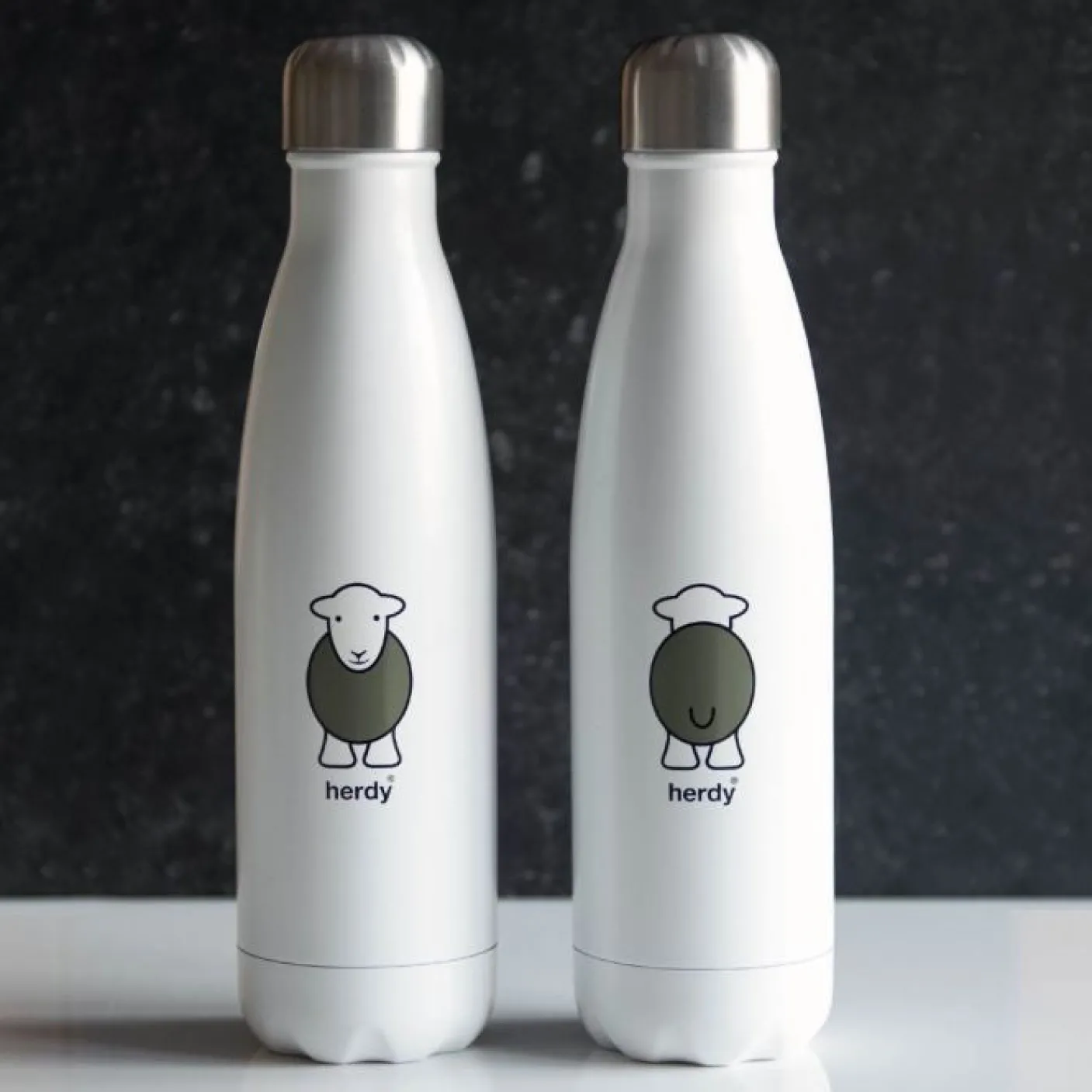Herdy’s re-ewes-able, stainless steel vacuum bottle will keep drinks hot or cold for hours.