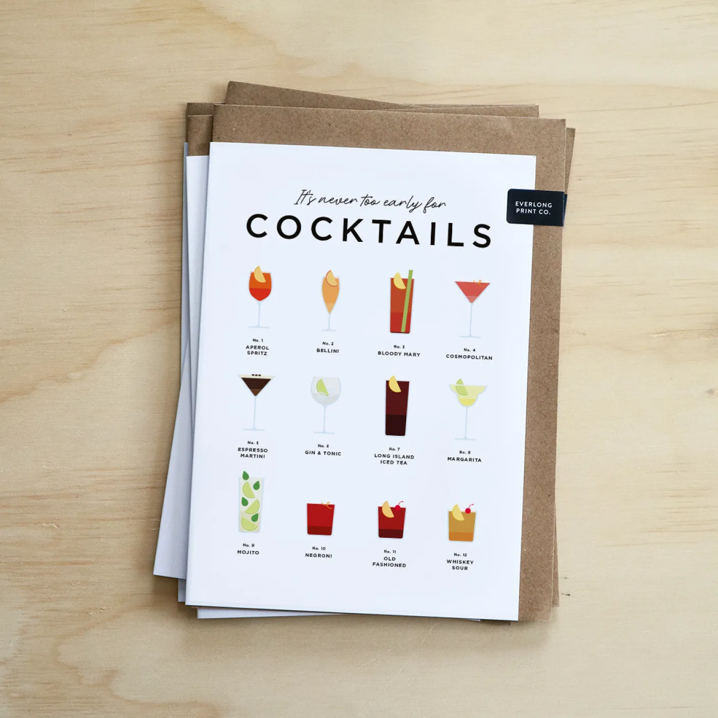 The card doubles as a cut-off cocktail recipe guide with the ingredients and methods printed on the inside left which the recipient can use to master all 12 classic cocktails. The inside right is blank for your handwritten note. The perfect keepsake for the cocktail lover in your life.