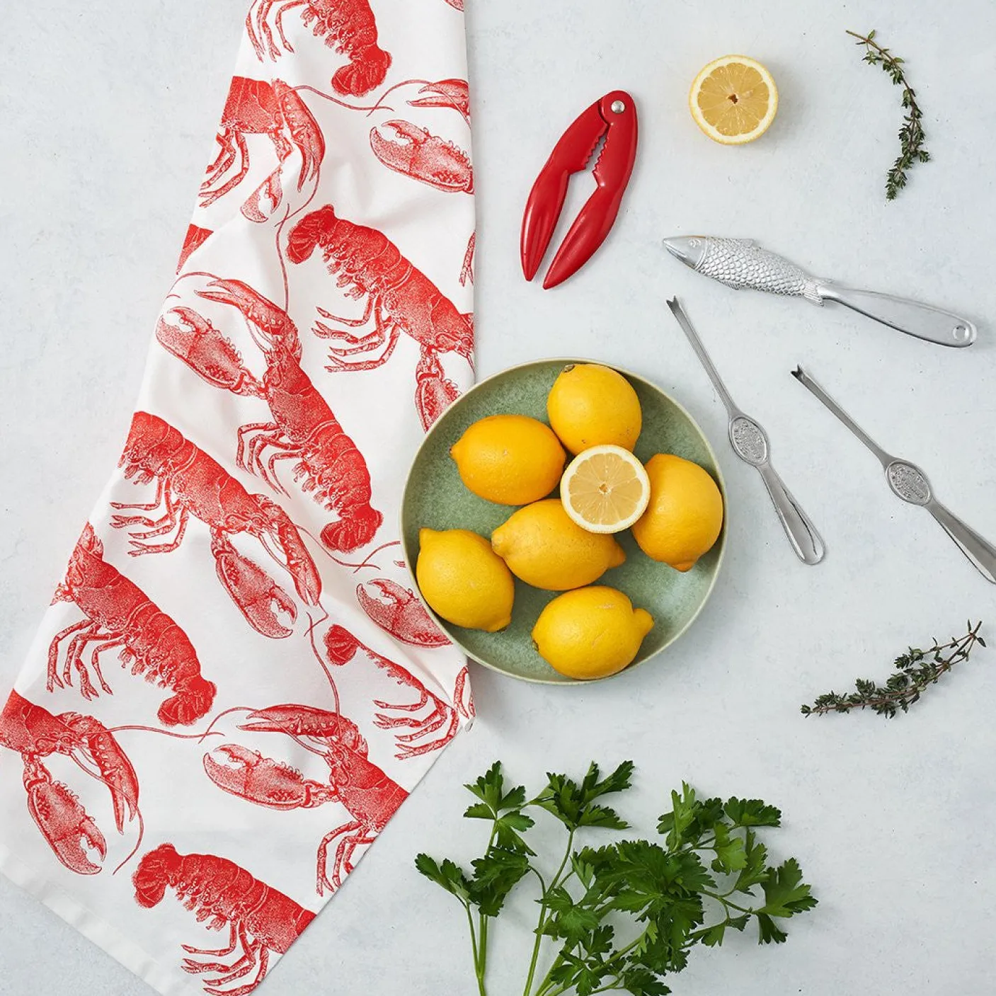 100% white cotton tea towel printed with vibrant coralred lobsters. A perfect addition to the designer kitchen and a great gift for the gourmet chef.