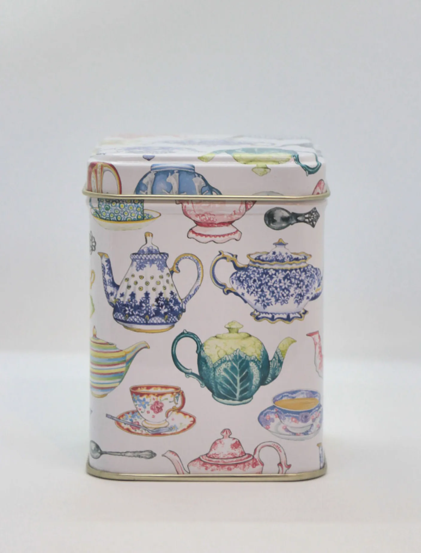This is a lovely mini tea tin is designed by Deborah Pope and is covered in teapots. See the matching rectangular tin for your biscuits or cream crackers!
