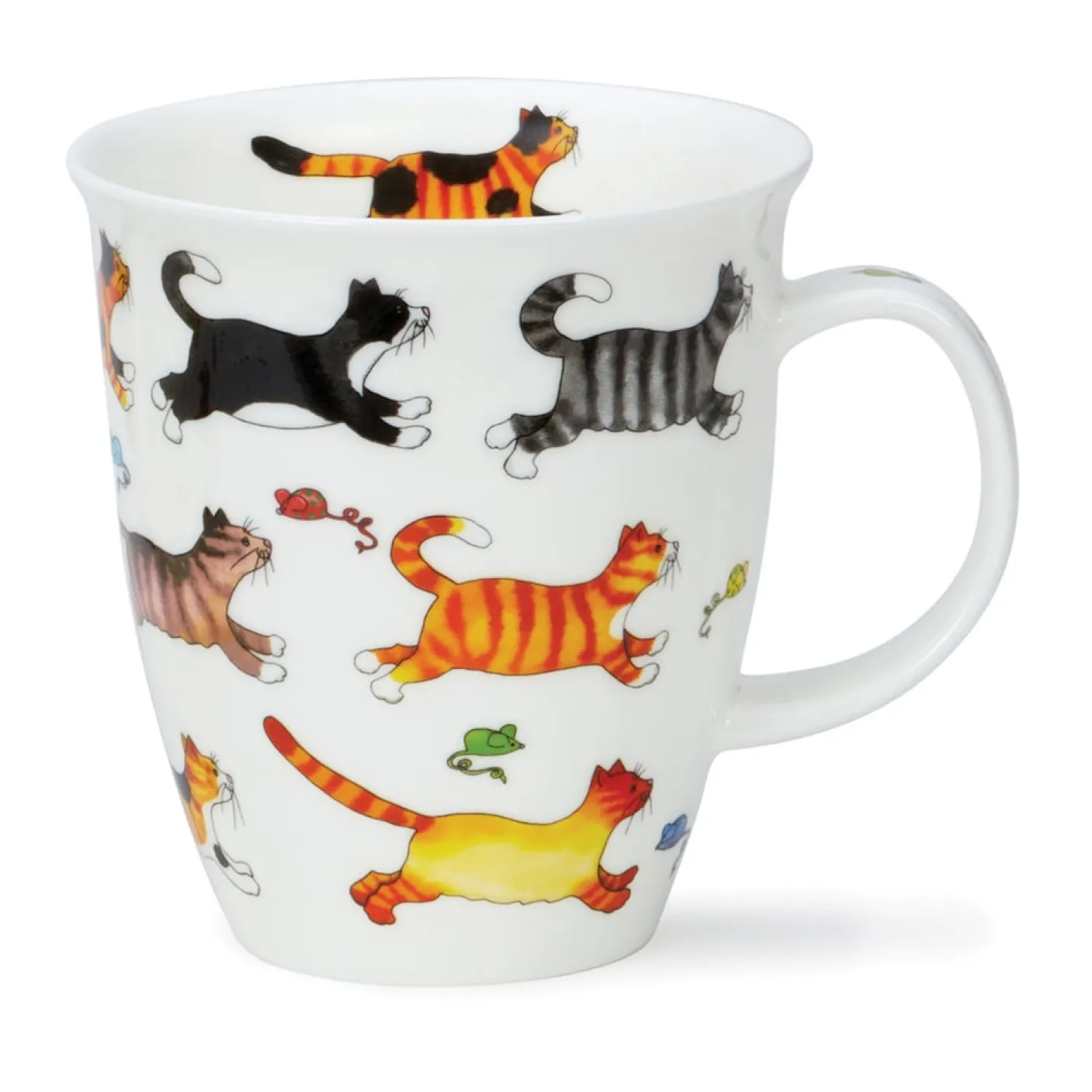 Playful cats of all breeds, run around one mug, chasing little brightly colored mice.