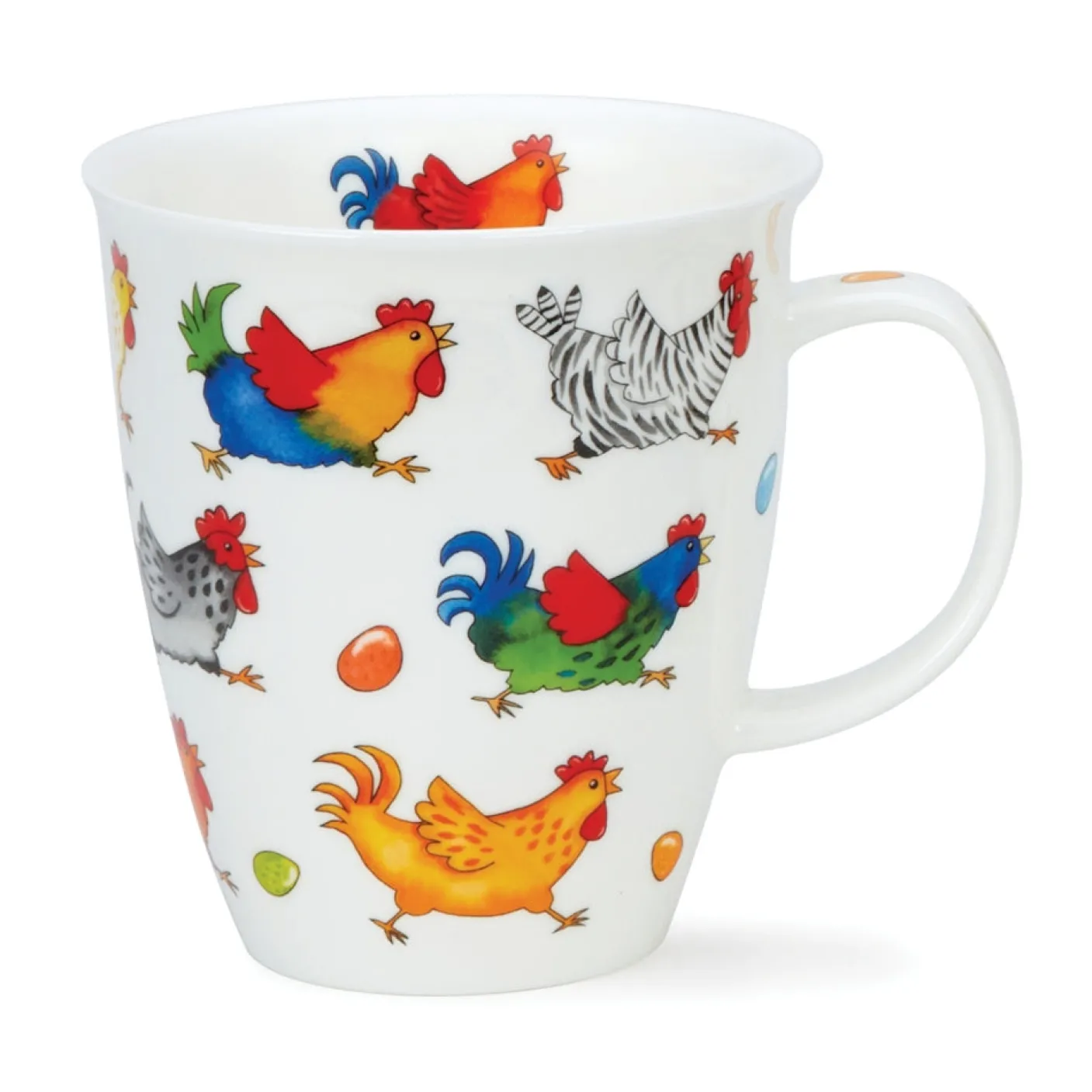 Brightly colored chickens flap and run their way around one in a comical fashion, surrounded by little multi-colored eggs.