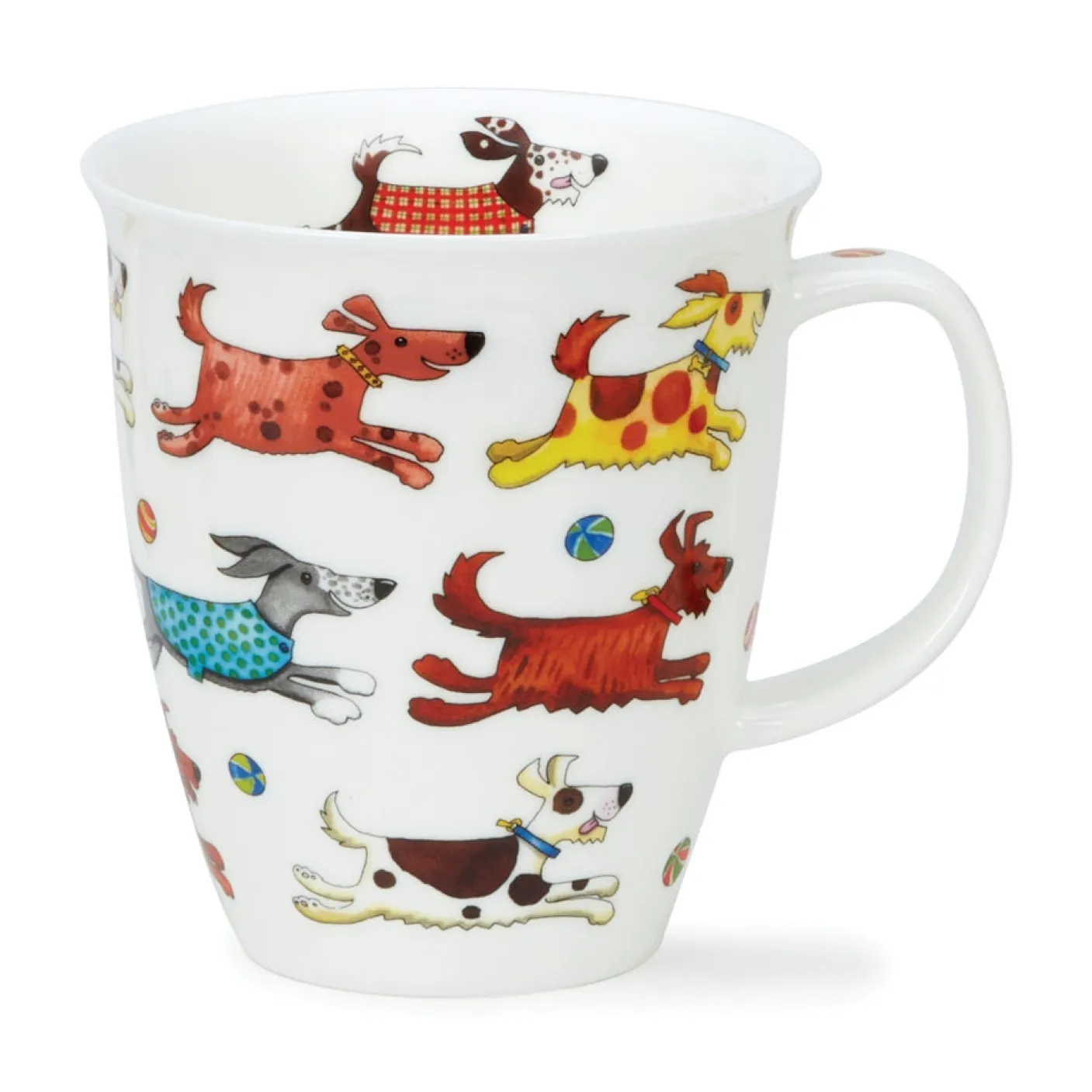 Playful dogs of all breeds, run around one mug, chasing little brightly colored soft balls