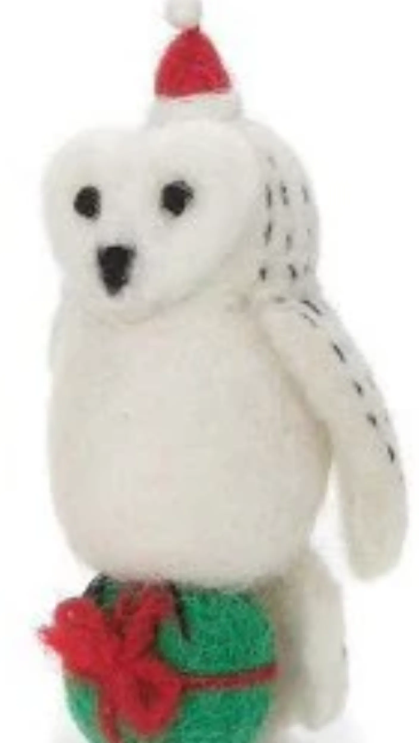 Twolovely designsfrom our Woodland Range – a barn owl and snowy owl each perched on a present. Comes with a hanging loop ready to go on the Christmas tree.