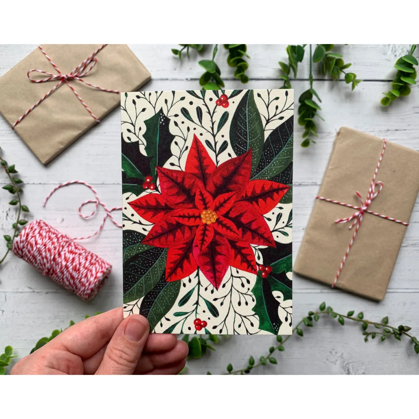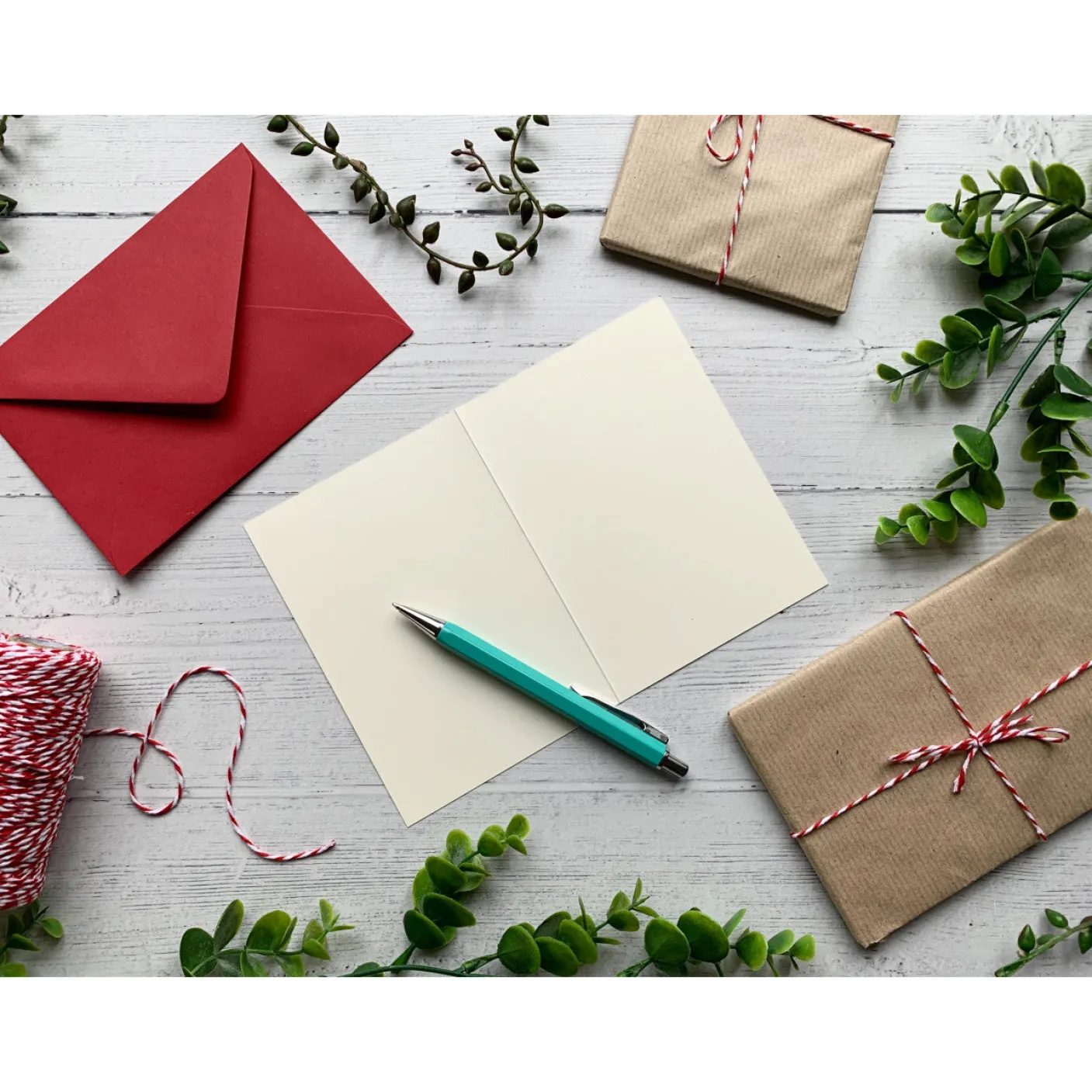 Luxury A6 Christmas card, printed in the UK on textured Aquerello paper. Each card comes packaged with a Kraft paper envelope and a compostable cellophane sleeve. Blank inside.