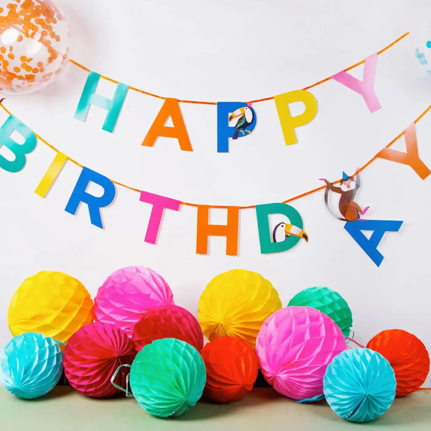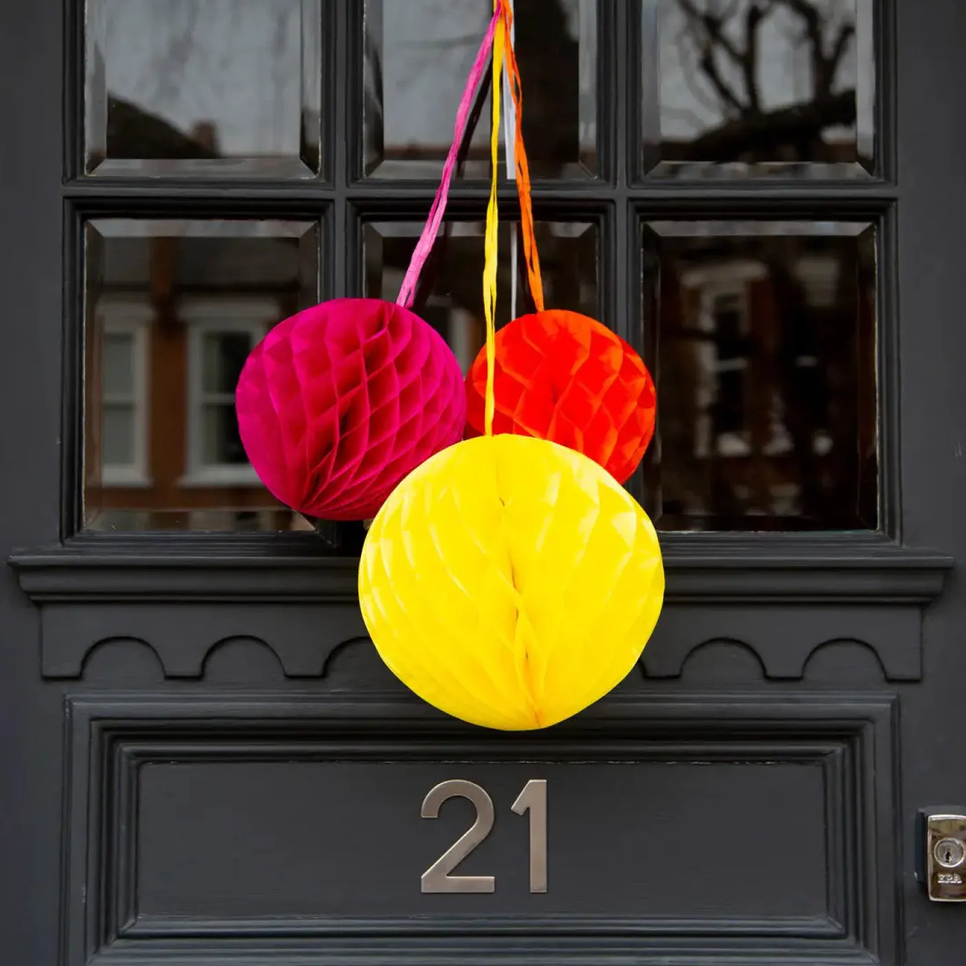 Pack of 3 rainbow paper honeycomb decorations by Talking Tables. Coming in a pack of 3 with a bright orange, red and yellow, these honeycomb decorations make a great addition to your core party decorations and are perfect as hanging party decorations for a rainbow birthday, pride, wedding or any celebration needing a pop of color.